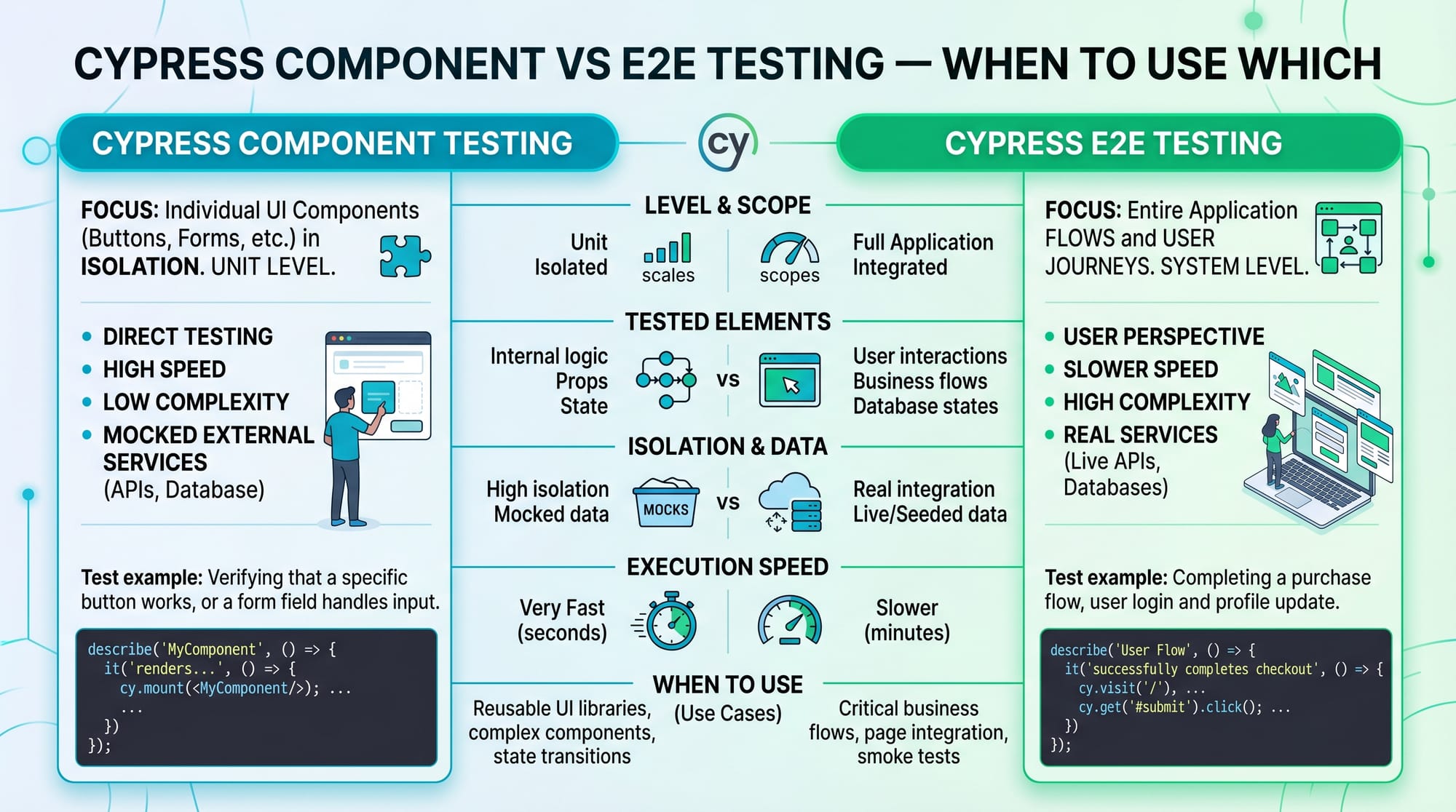 Cypress Component Testing is a modern approach to testing individual UI components in isolation using Cypress, a popular JavaScript testing framework. Unlike traditional end-to-end (E2E) testing, where you test the entire application flow, cypress component testing allows you to focus on smaller pieces like buttons, forms, and UI elements in frameworks such as React and Vue.