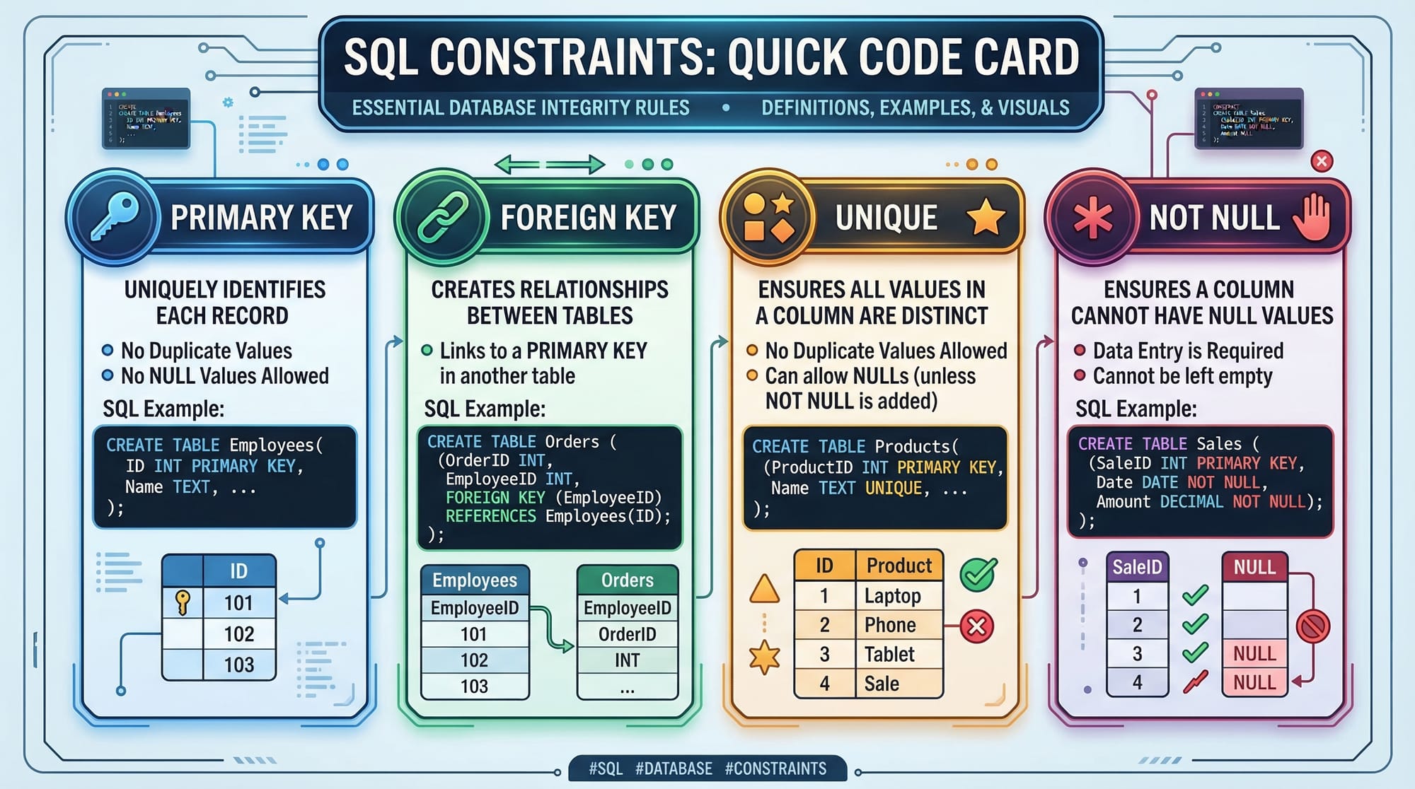 PRIMARY KEYensures uniqueness.FOREIGN KEYmaintains referential integrity.NOT NULLensures essential fields are always filled.