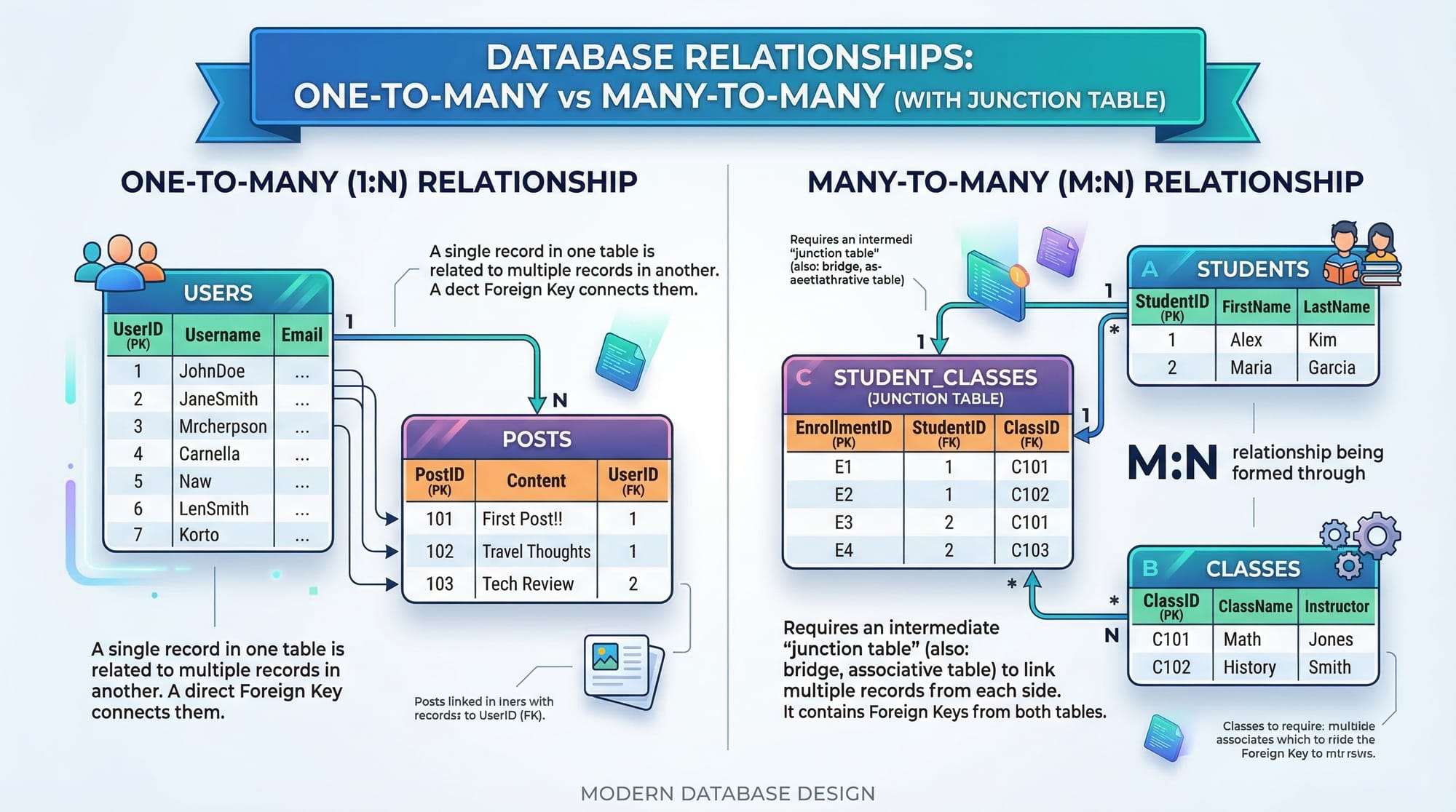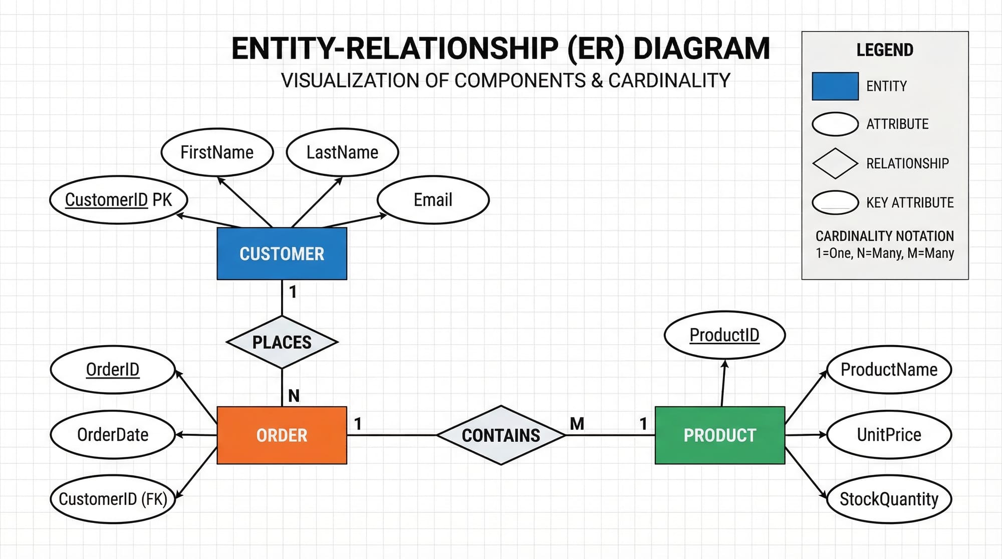 - Relationships: Connections between entities (1:1, 1:N, M:N)