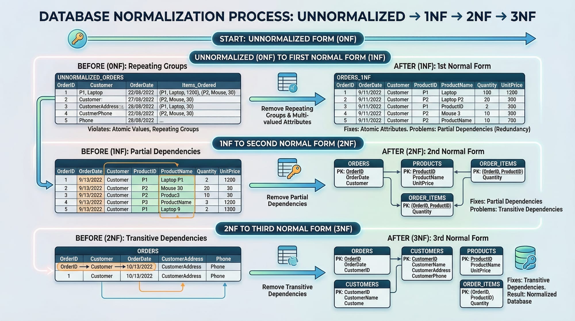 Fix: Use 1NF → 2NF → 3NF normalization as shown earlier.