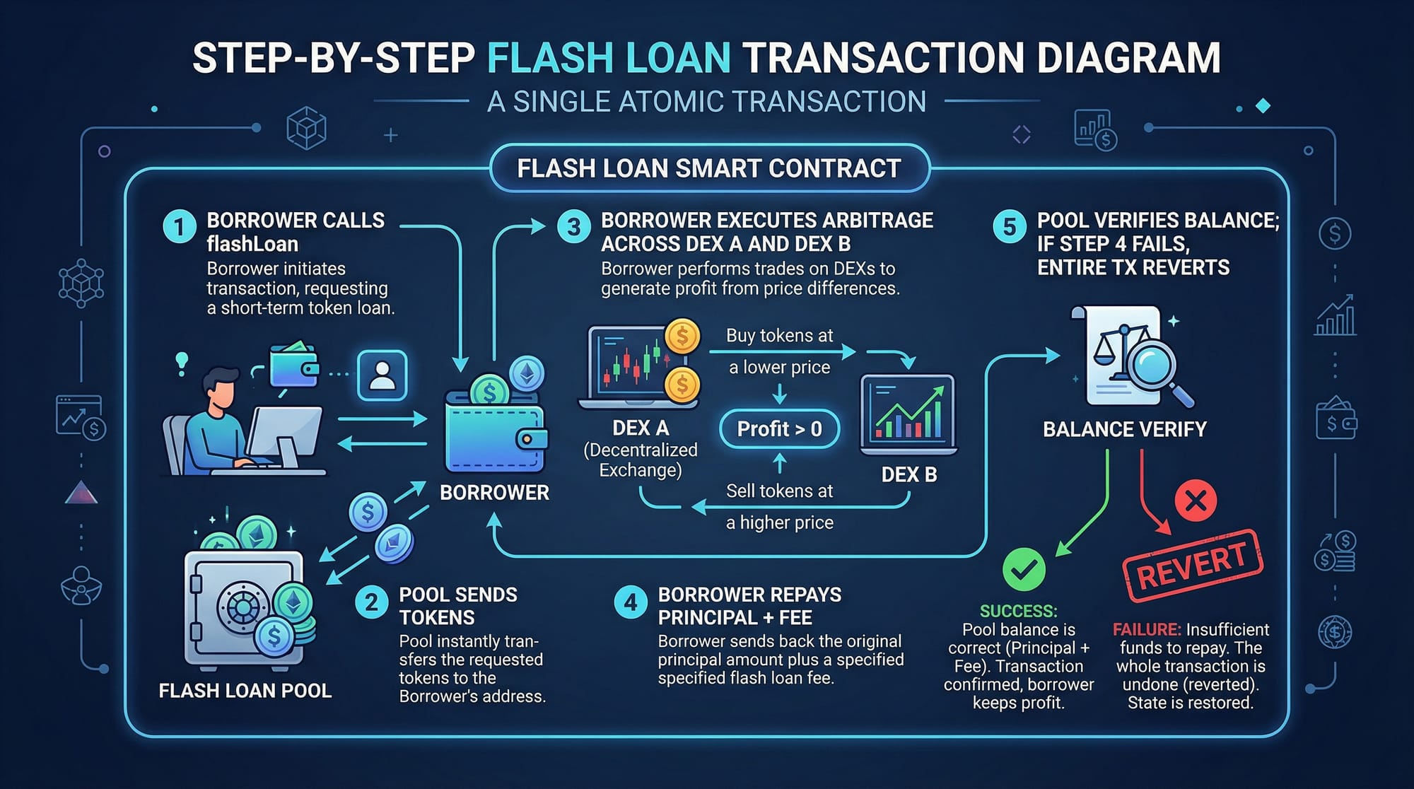- Flash loans are uncollateralised, single-transaction loans enforced entirely by the EVM's atomicity guarantee. They power arbitrage, liquidations, and collateral swaps.