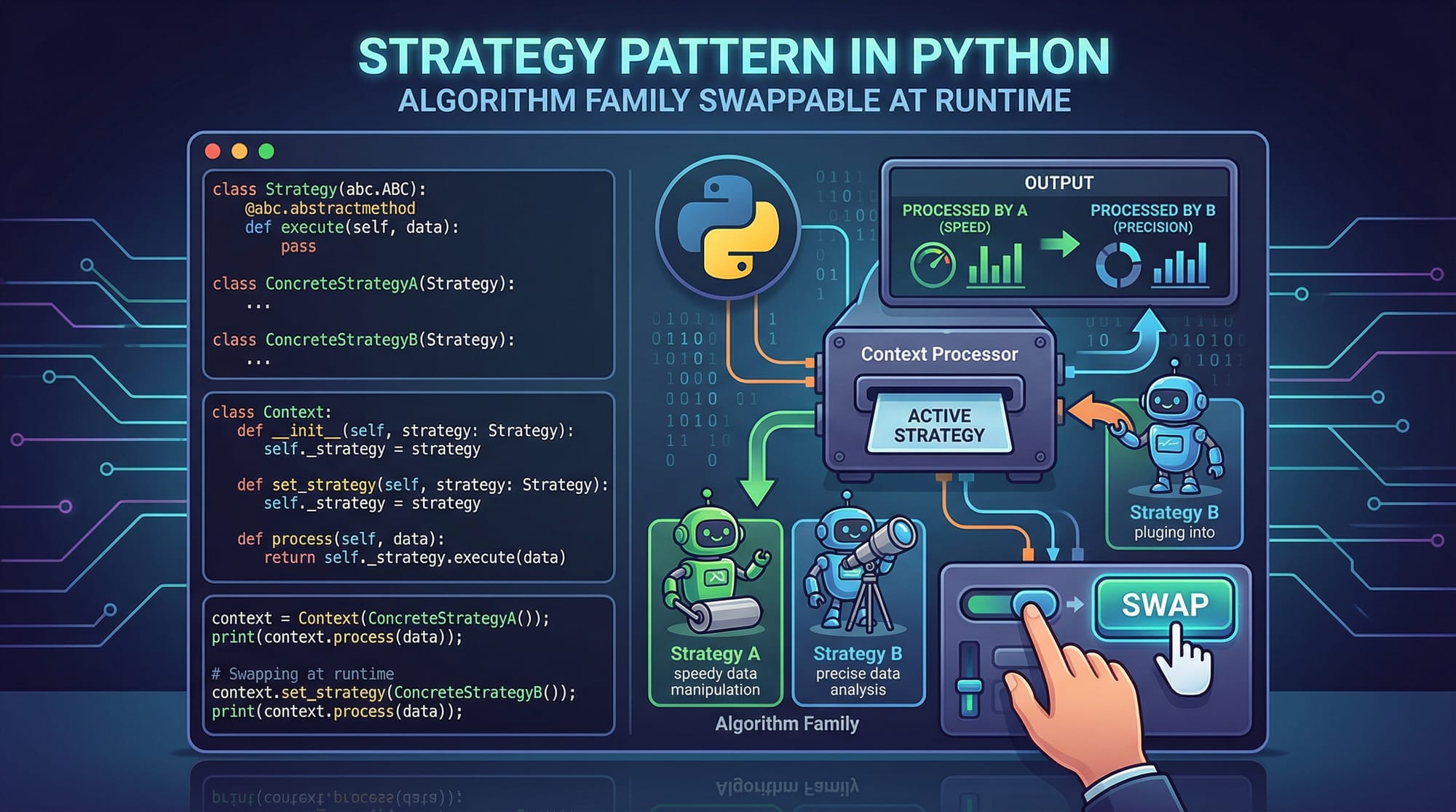 Explanation: Payment methods are swappable at runtime without changing core logic.