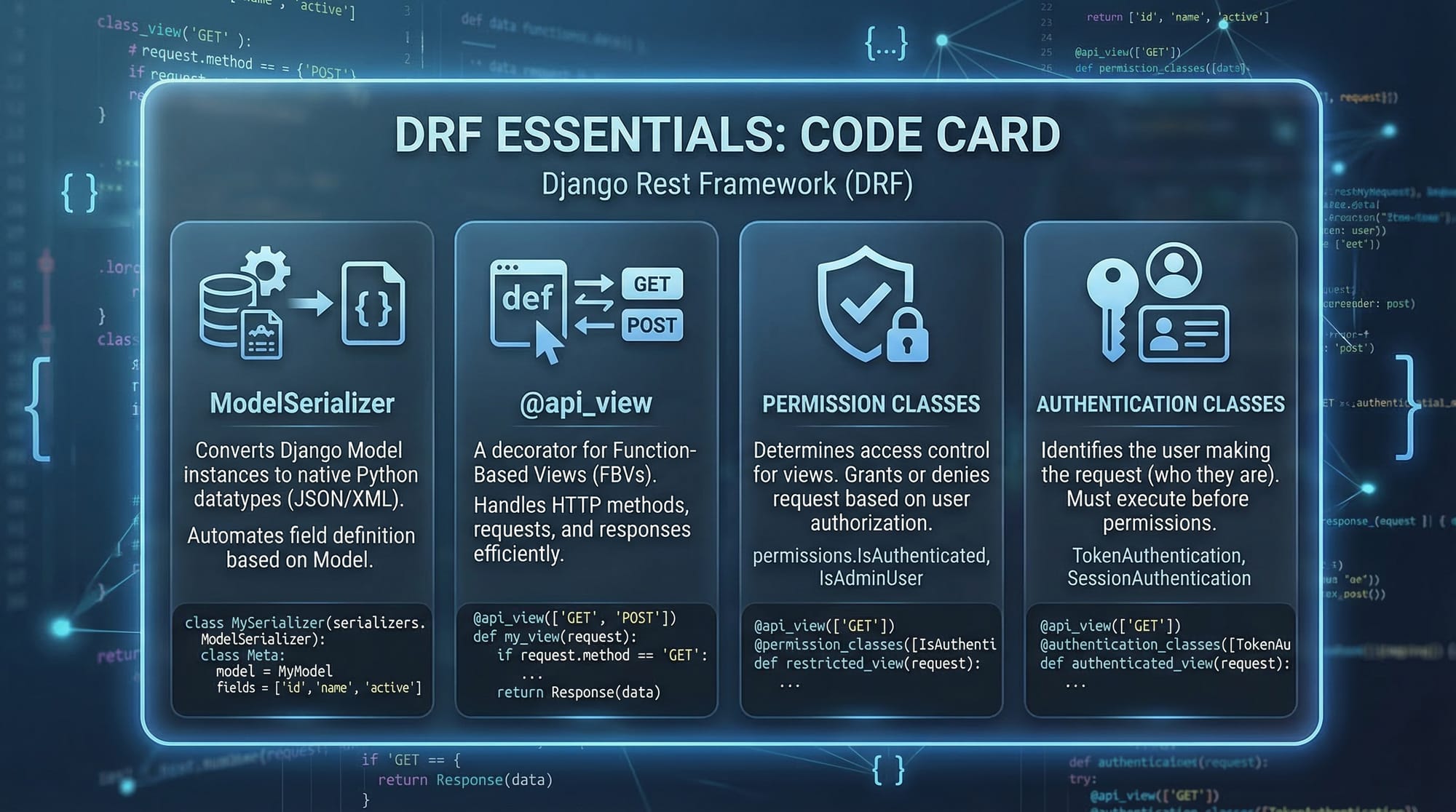 serializers.ModelSerializer→ Automatically maps model fields.class Meta:→ Configuration class.model = Student→ Connects serializer to model.fields = [...]→ Specifies fields to include.