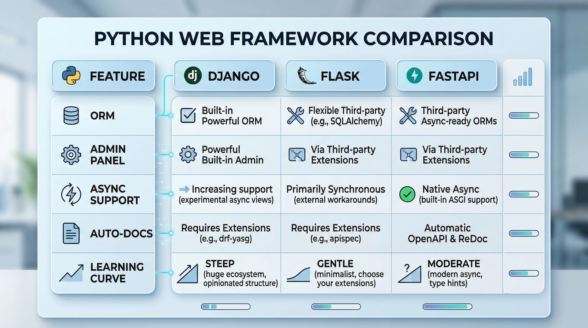 - ORM, admin panels, and async support vary among frameworks.