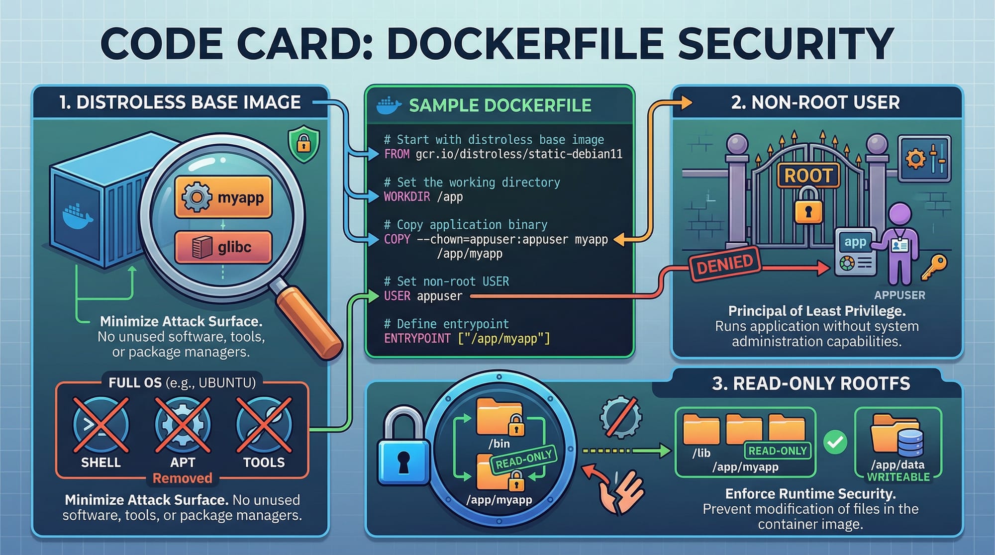 FROM node:18-alpine→ Uses lightweight image, reducing attack surfaceWORKDIR /app→ Sets working directory inside containerCOPY package*.json ./→ Copies only dependency files first for cachingRUN npm install --only=production→ Avoids unnecessary dev dependenciesCOPY . .→ Copies app codeRUN addgroup...→ Creates secure user groupUSER appuser→ Prevents running as rootEXPOSE 3000→ Documents port usageCMD ["node", "app.js"]→ Runs the application