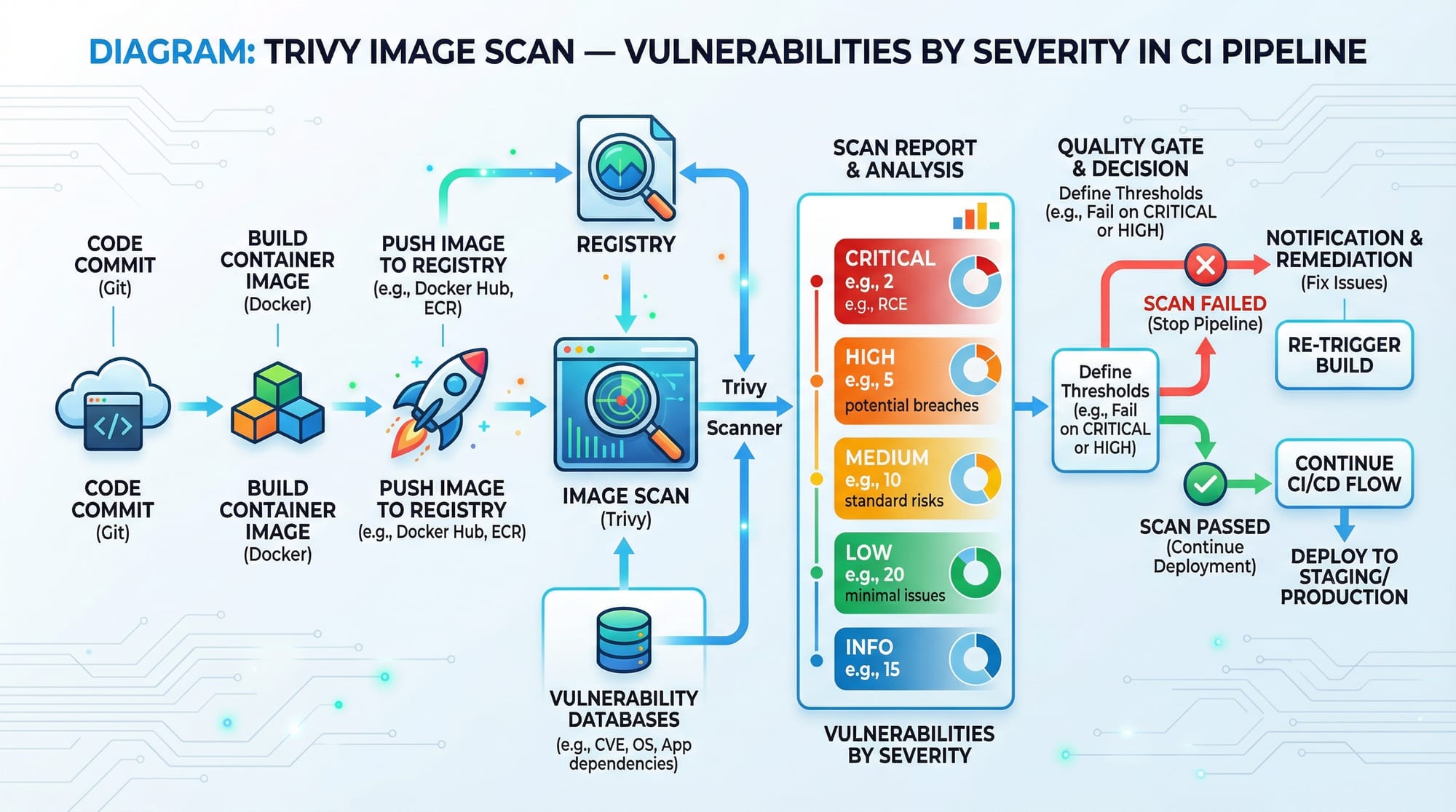 trivy image→ scans container imagemyapp:latest→ target image- Outputs vulnerabilities by severity