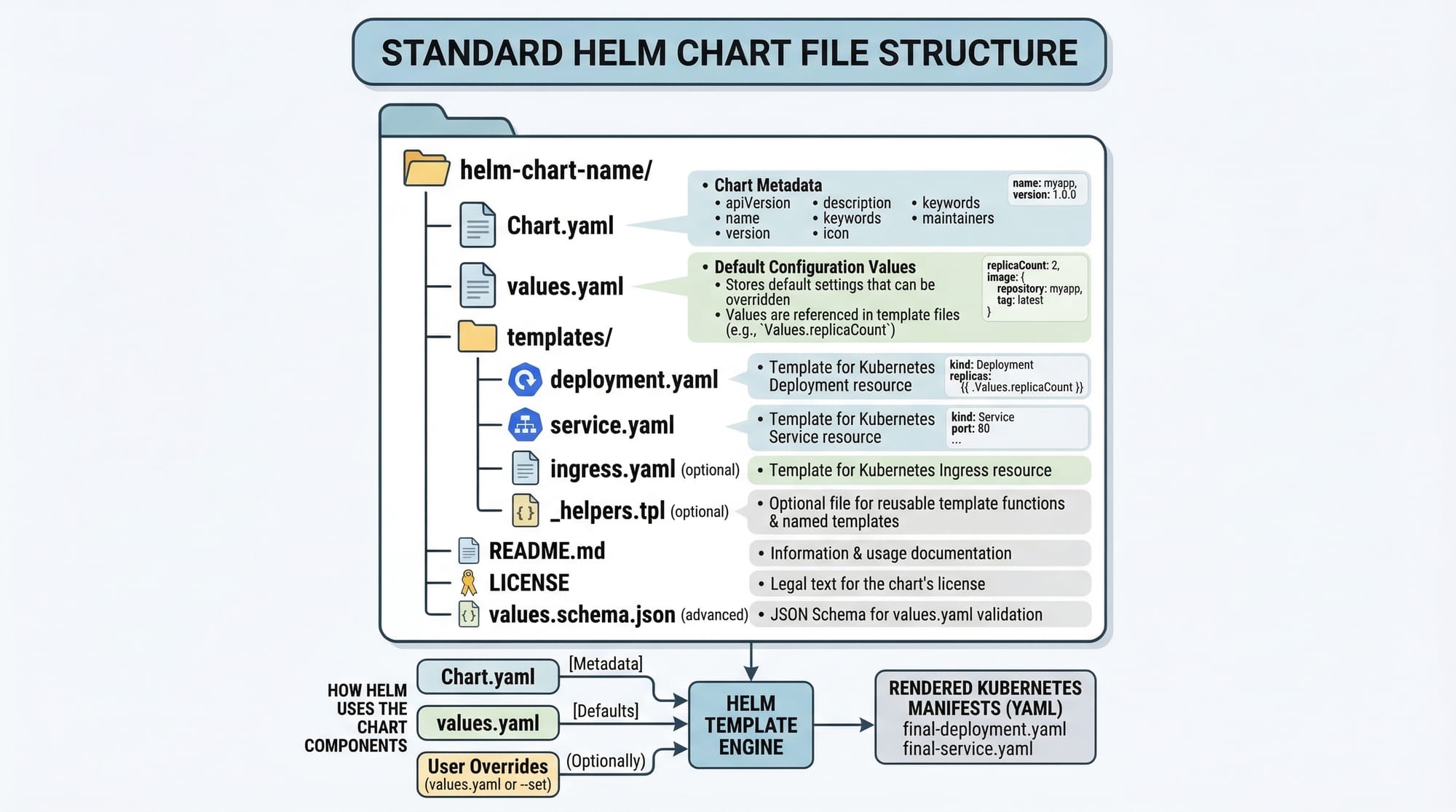 Chart.yaml→ Metadatavalues.yaml→ Configuration valuestemplates/→ Kubernetes manifests