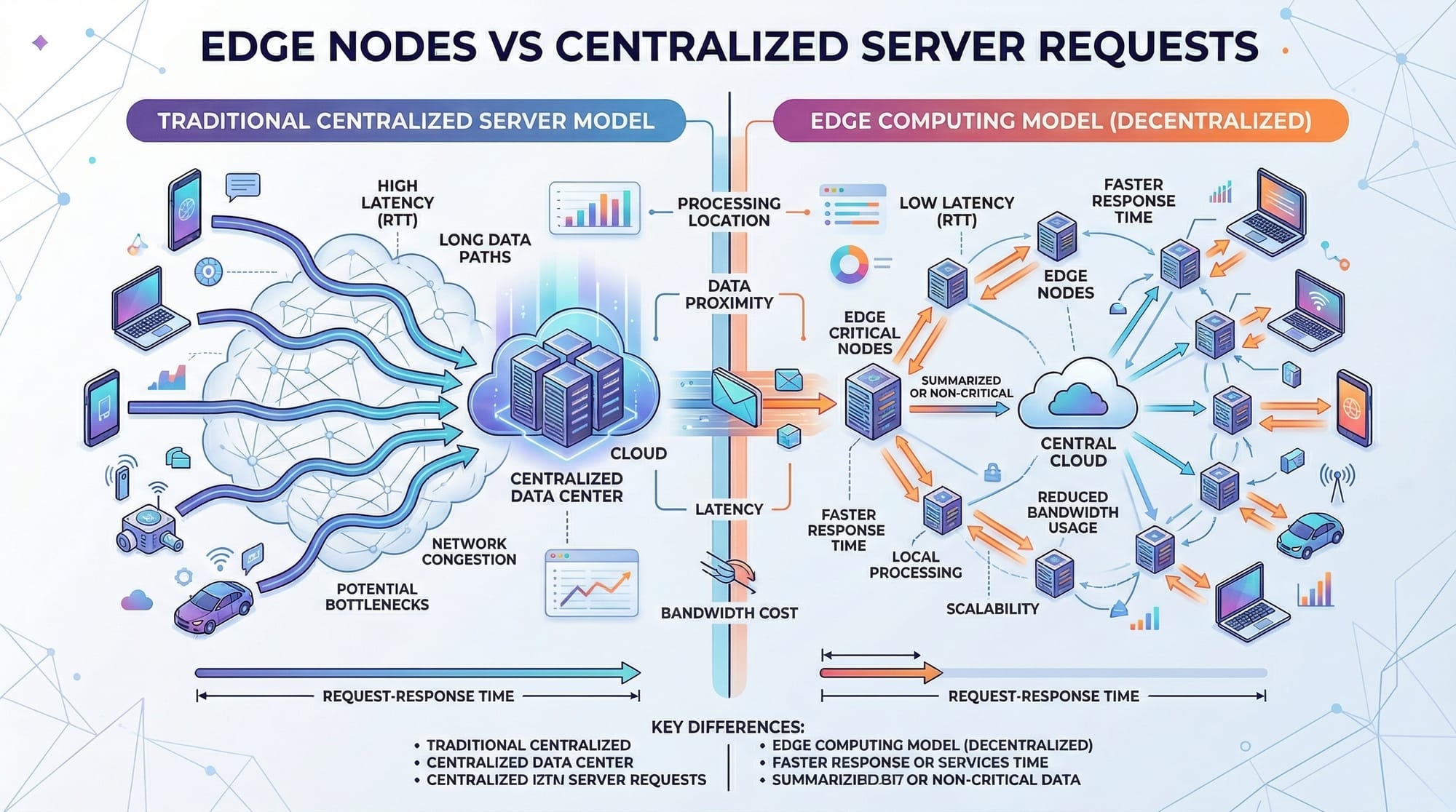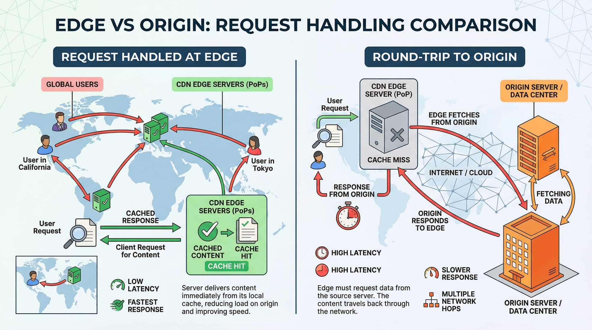 Edge nodes process requests near the user, while origin servers are centralized, often resulting in higher latency for distant users.