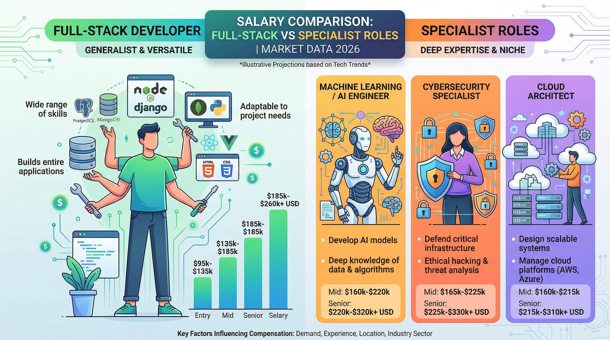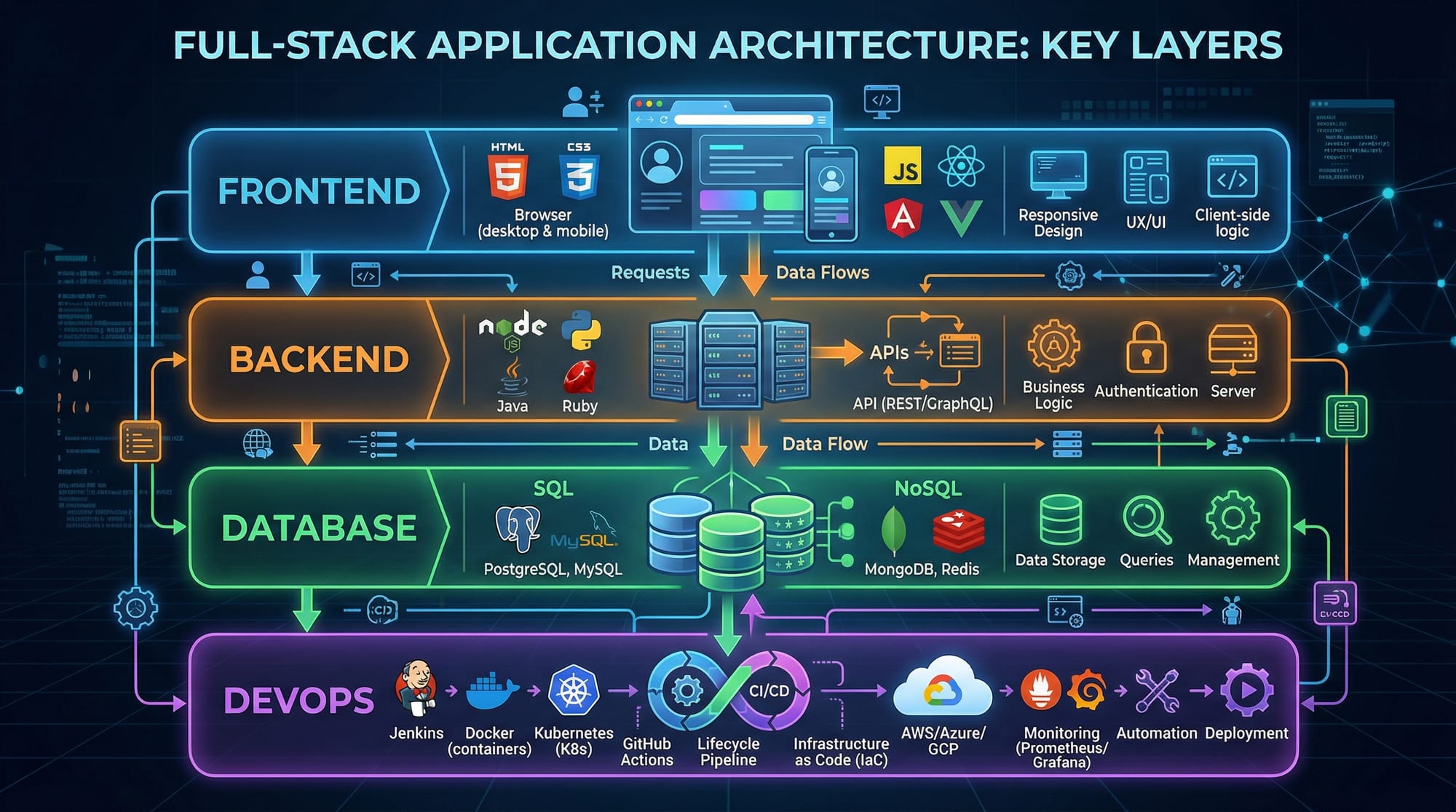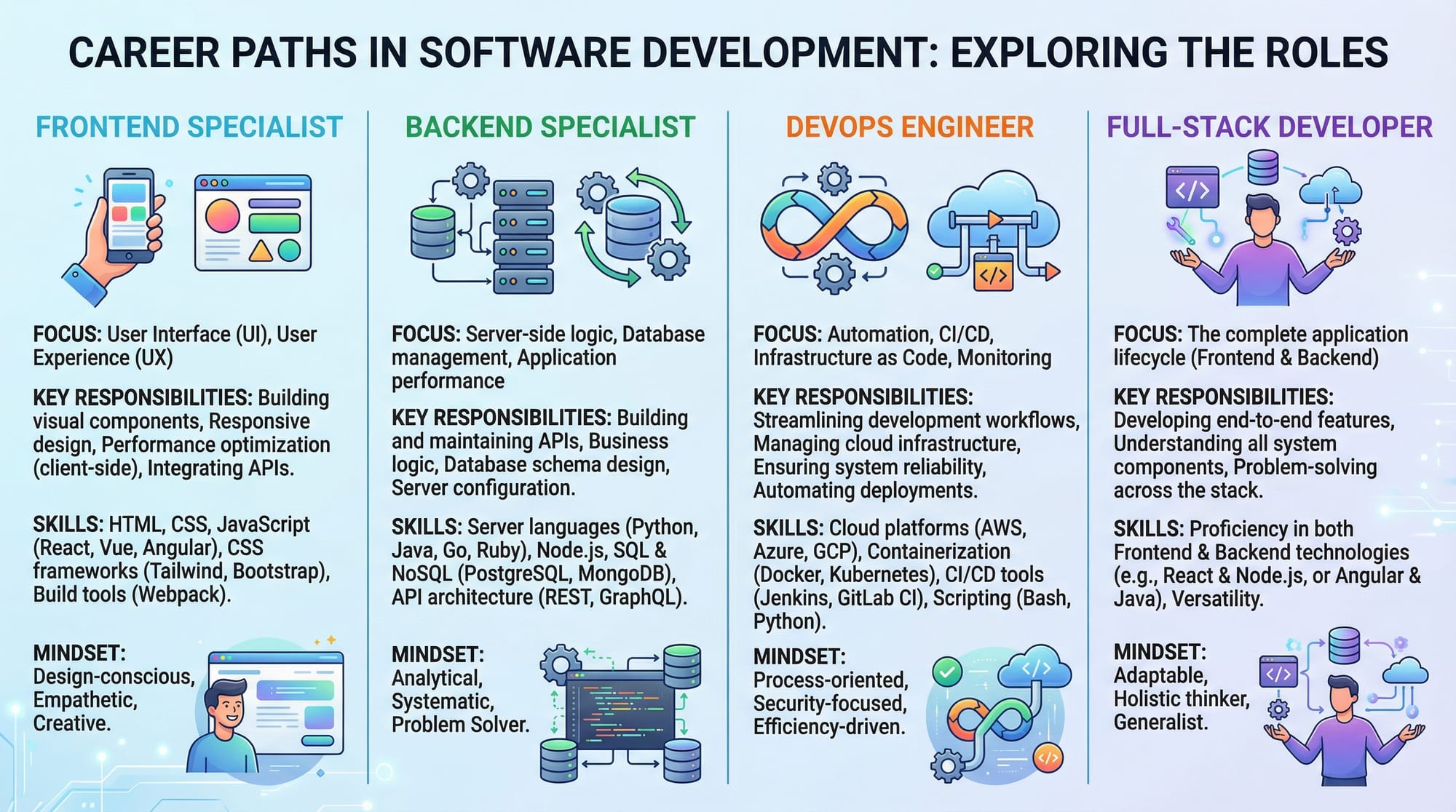 - Full-stack developers handle frontend, backend, and databases.