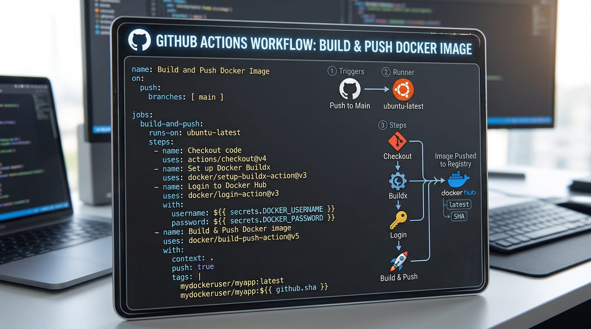 docker build: Builds the image.docker login: Authenticates to GHCR.docker push: Publishes the image.