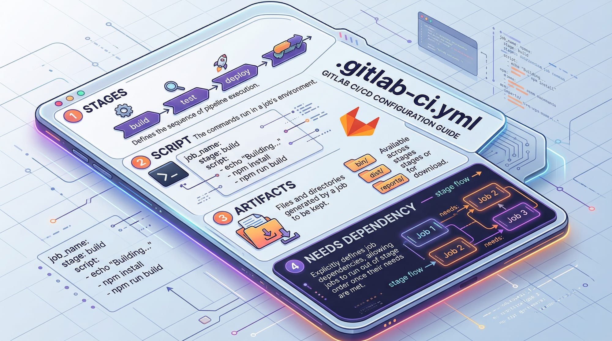 .gitlab-ci.yml. - Runners execute pipeline jobs and can be shared or project-specific.