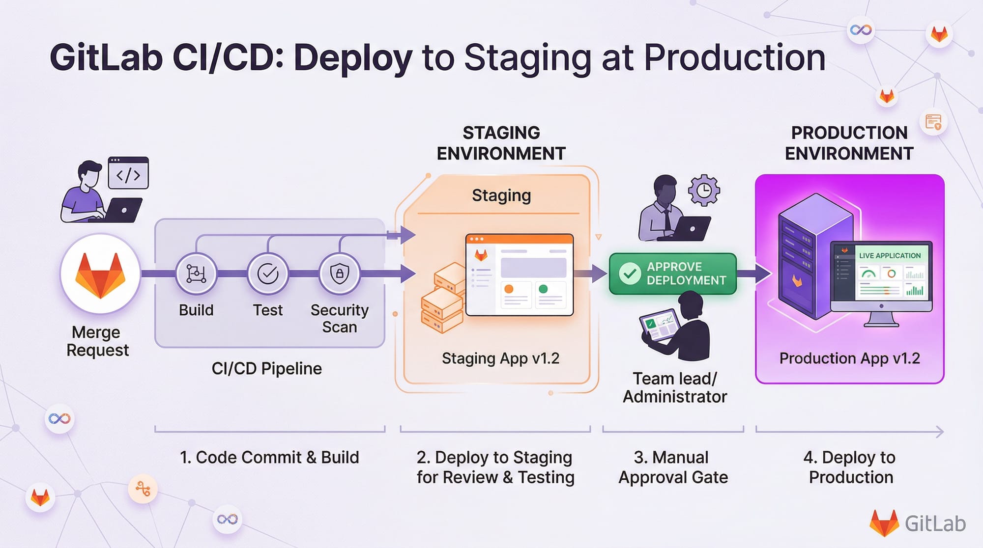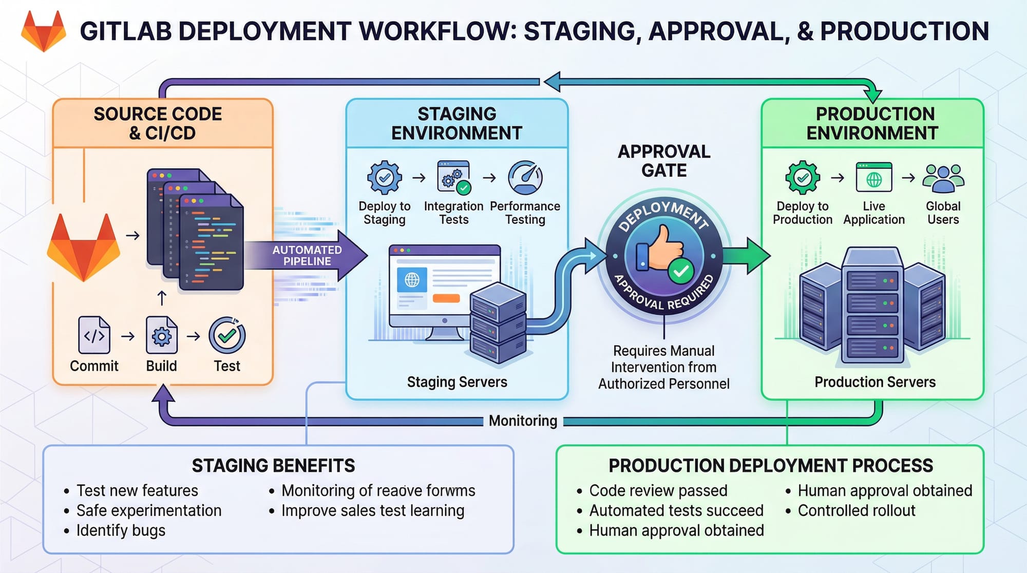 GitLab allows you to deploy code to different environments, such as staging or production, with optional manual approvals.