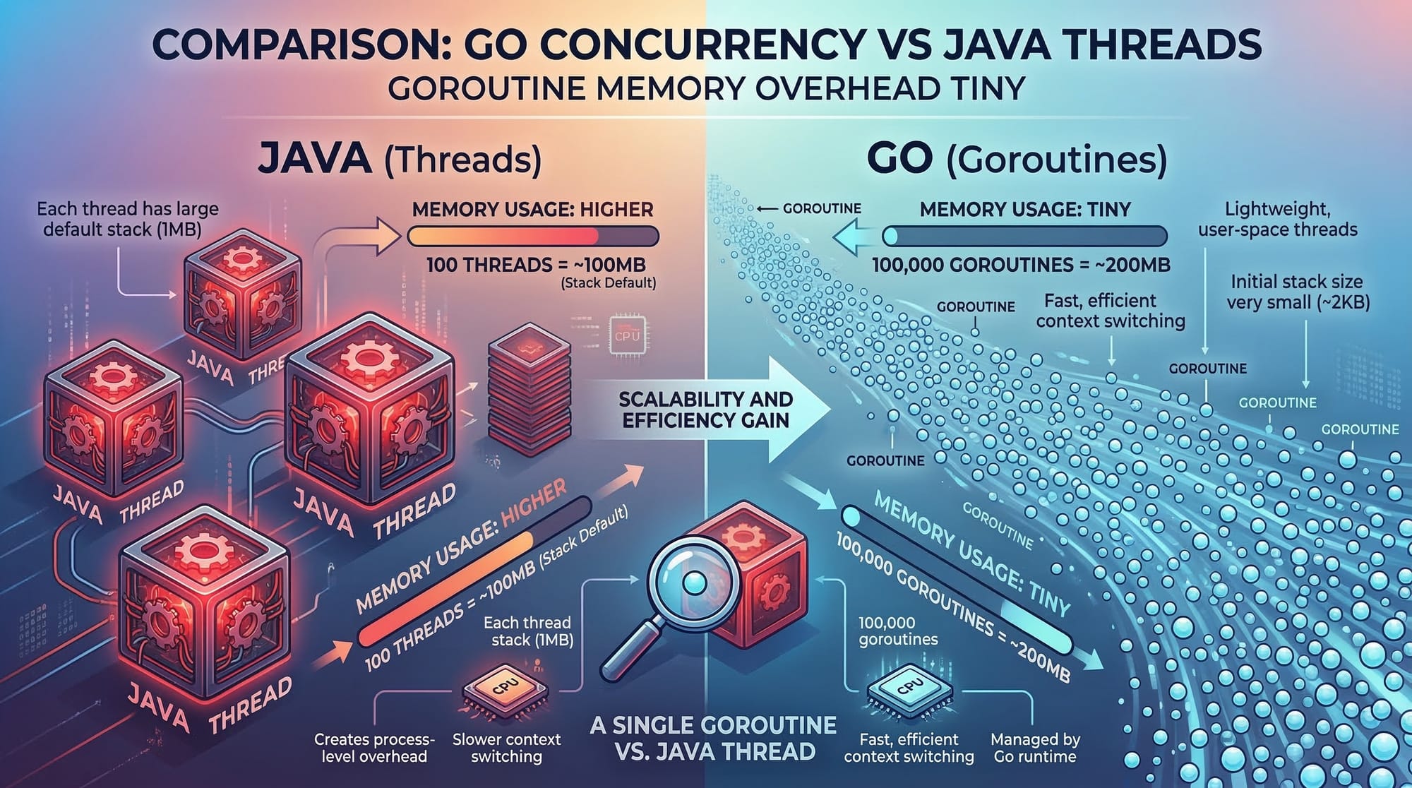 Go goroutines are lighter and more efficient, with low memory overhead, compared to heavy OS threads in Java.