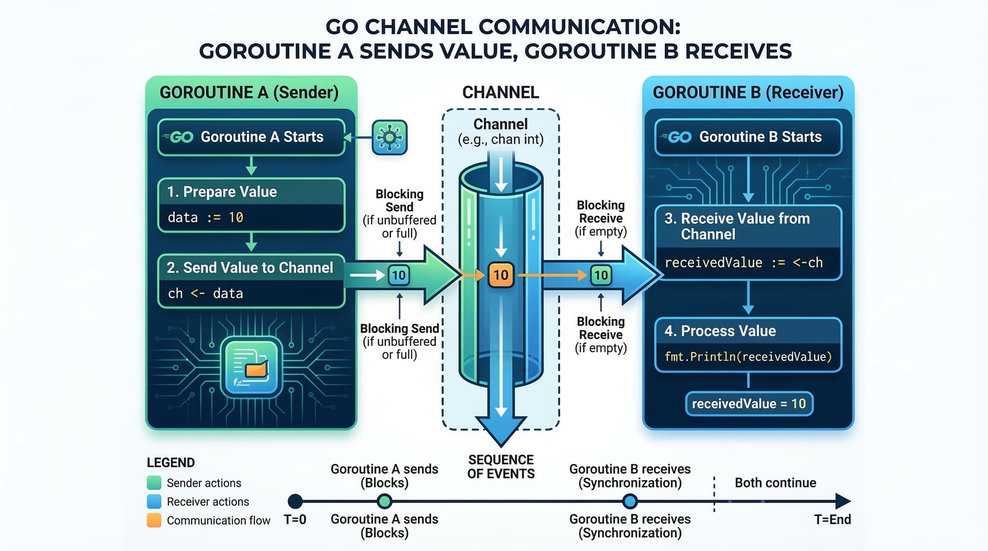 Channels are Go’s way of synchronizing goroutines. They allow one goroutine to send data to another safely.