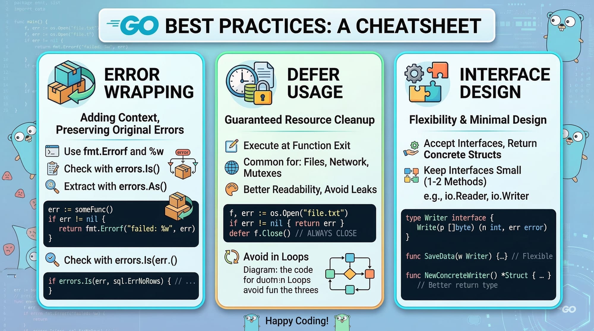 Always check errors, use defer for resource cleanup, design flexible interfaces, and follow standard project structure.