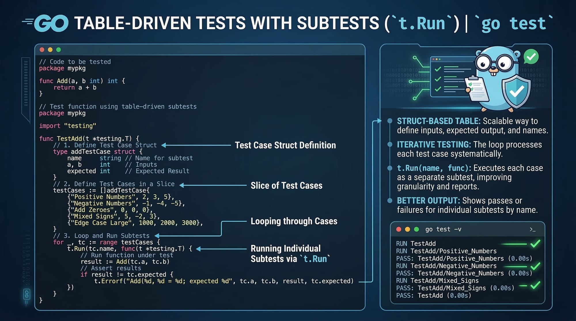 testsarray defines multiple test cases.t.Runruns each case as a subtest.- Enhances test readability and maintenance.