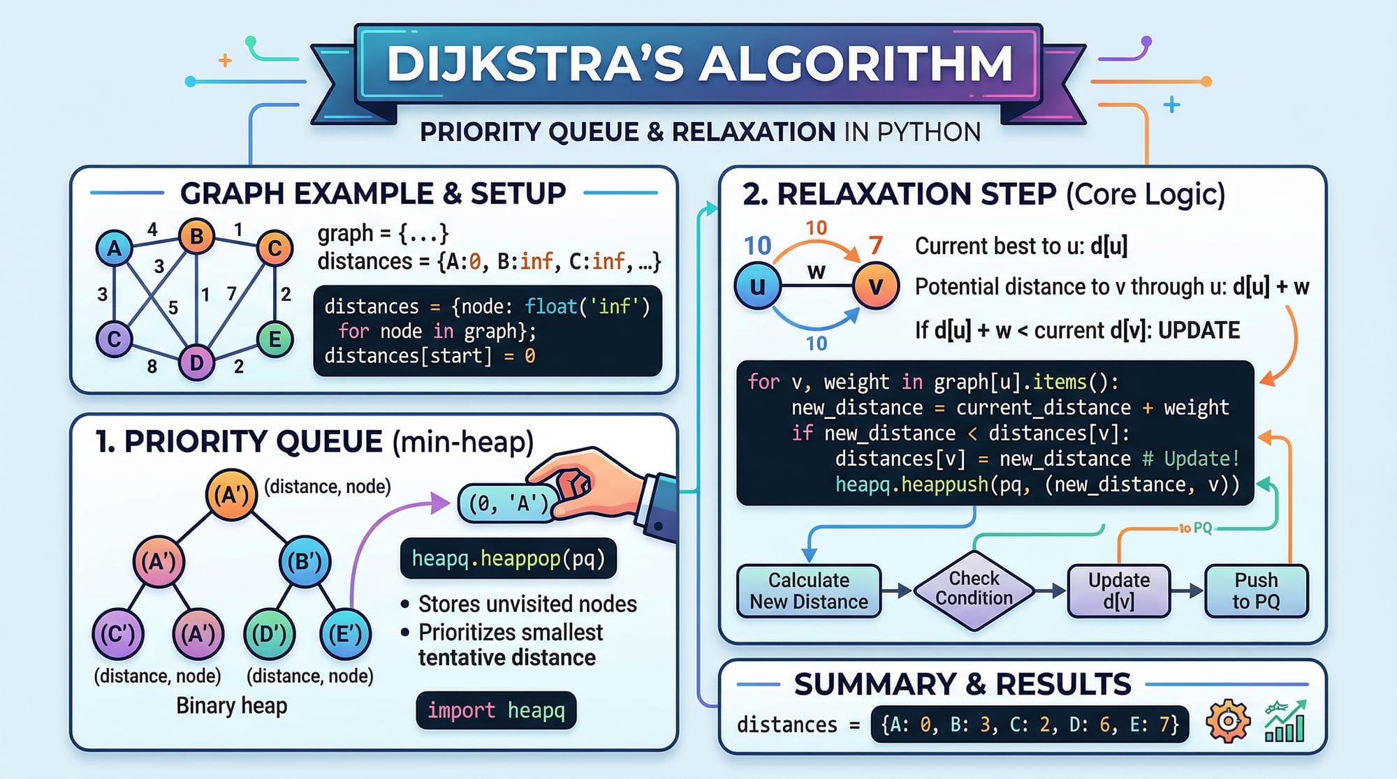 heapq→ Implements priority queuedistances→ Stores shortest distancesfloat('inf')→ Initialize with infinitypq = [(0, start)]→ Start node distance = 0heappop()→ Get smallest distance nodefor neighbor, weight→ Traverse edgesdistance = current_distance + weight→ Relaxation stepif distance < distances[neighbor]→ Update shortest path