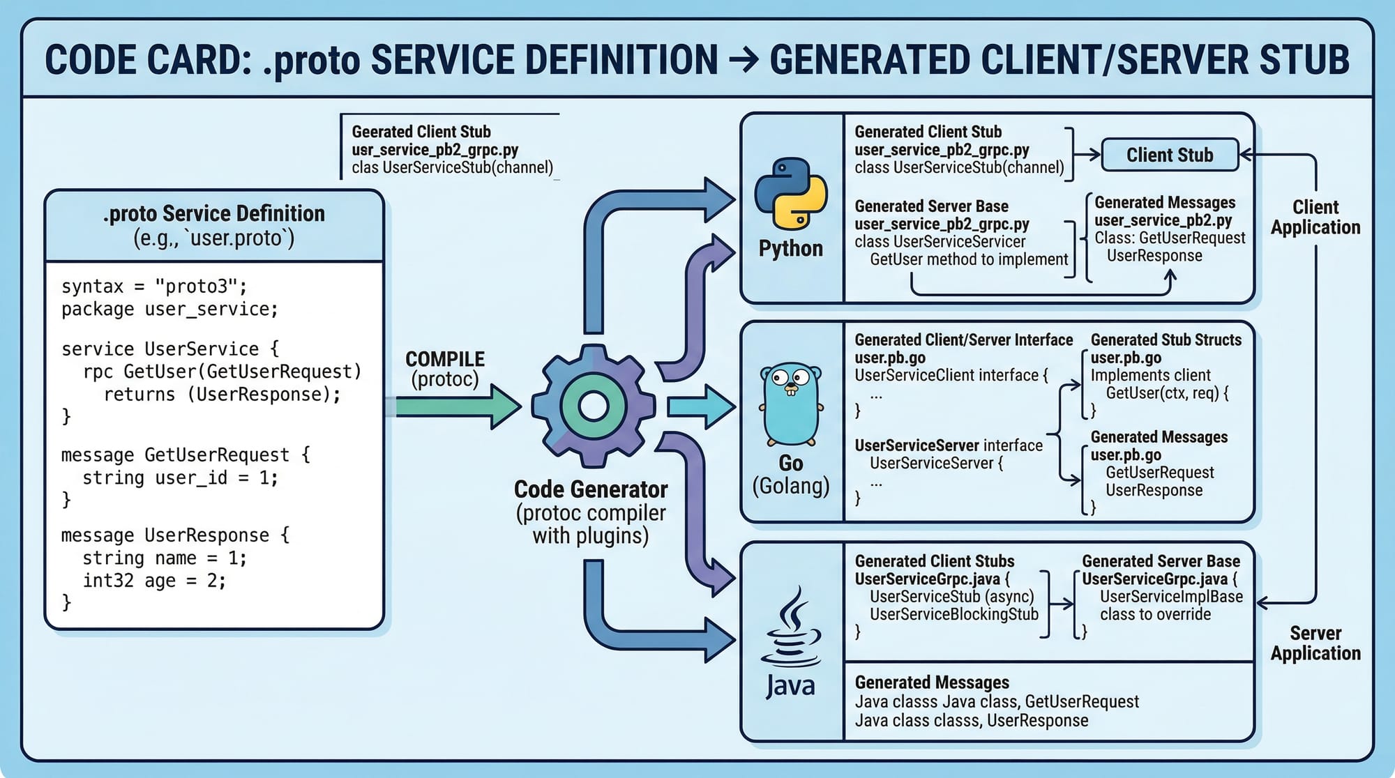 syntax = "proto3";→ Uses Protobuf version 3.package student;→ Namespaces the service.service StudentService→ Defines the RPC service.rpc GetStudent→ Unary RPC (one request → one response).message→ Defines structured data with field types and unique IDs.