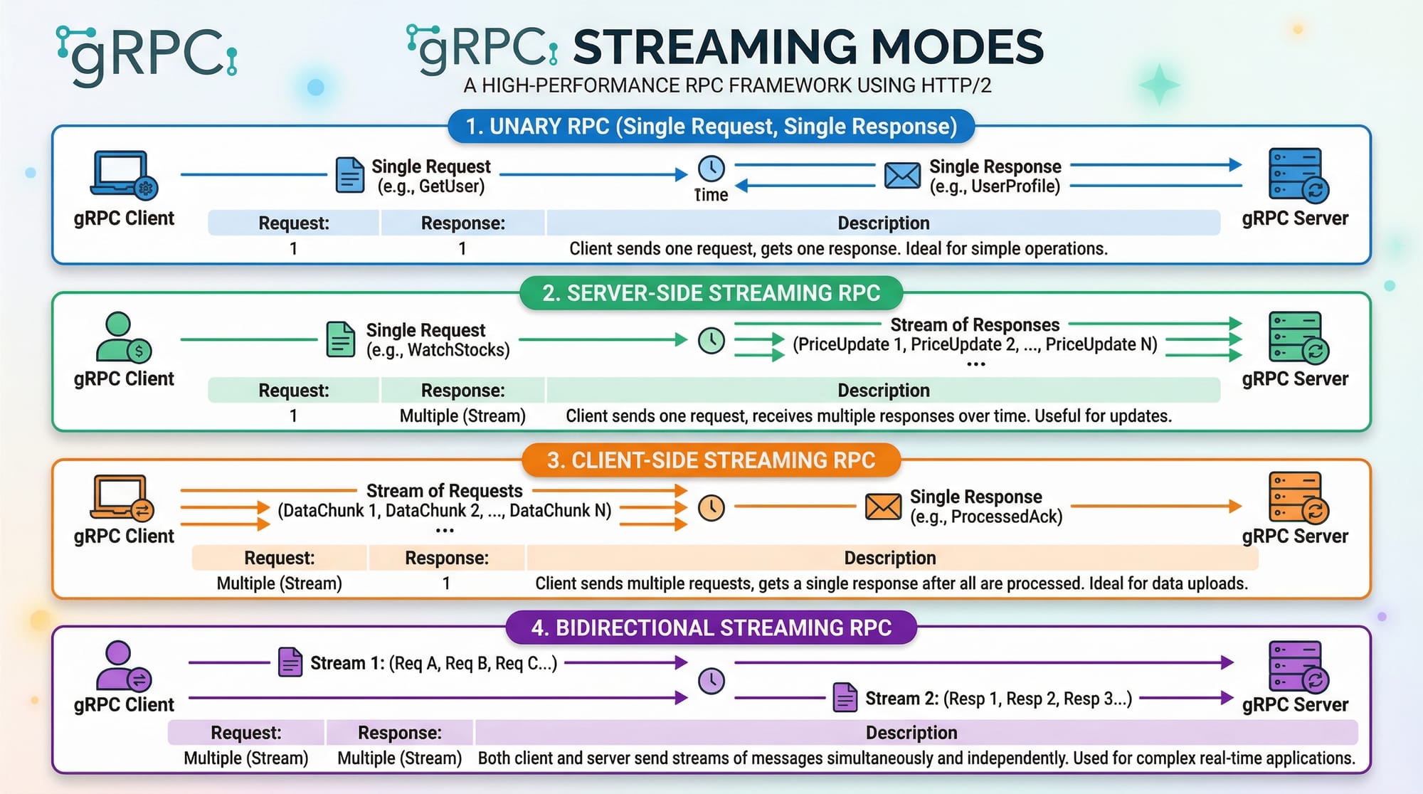 - Bidirectional streaming: Multiple requests ↔ multiple responses.