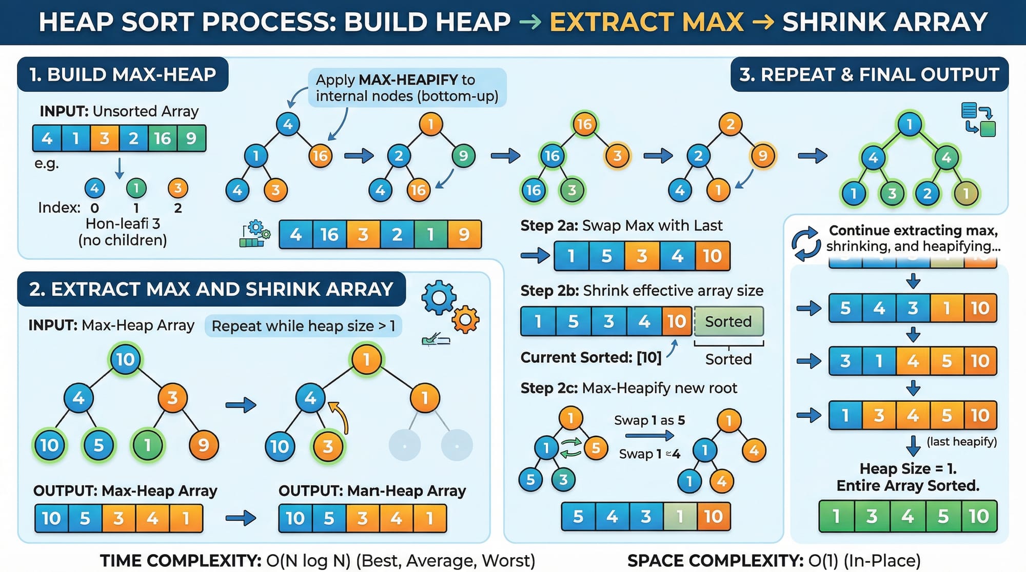 - Compare with children; swap with the smaller (min-heap) or larger (max-heap) child until heap property is restored.
