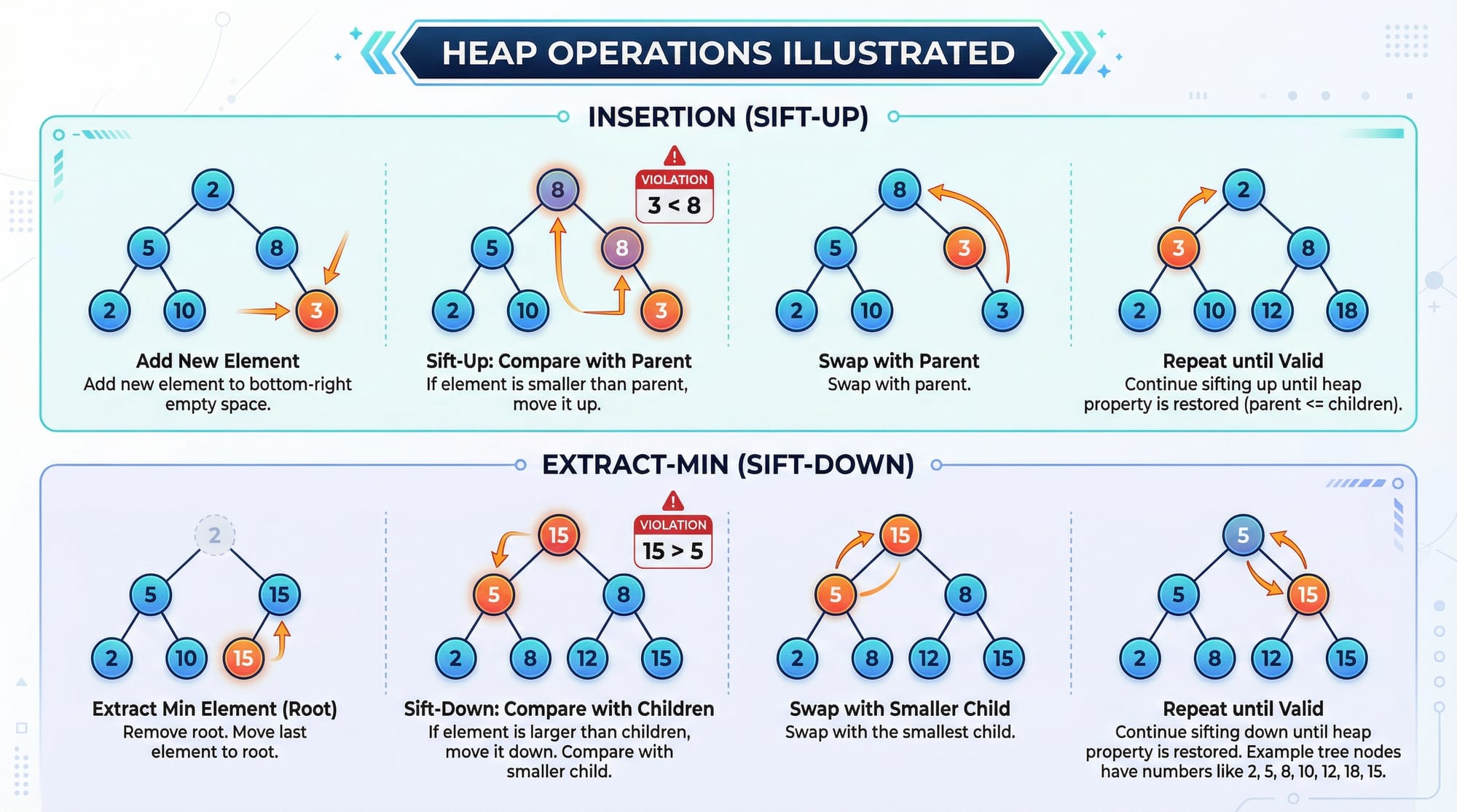 - Compare with parent; if heap property is violated, swap and repeat until fixed.