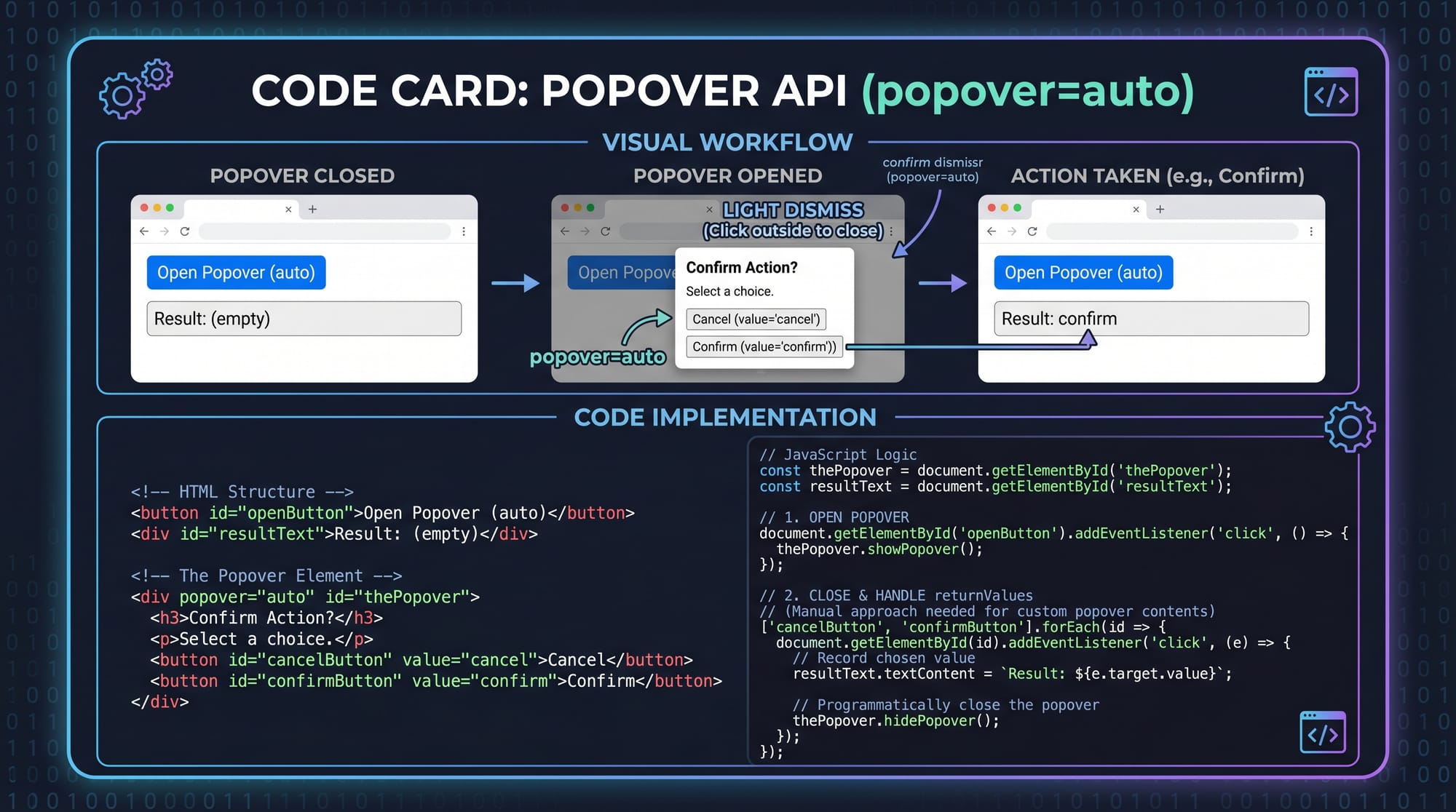popover="auto"→ automatically manages visibilitypopover="manual"→ controlled manually via JavaScript
