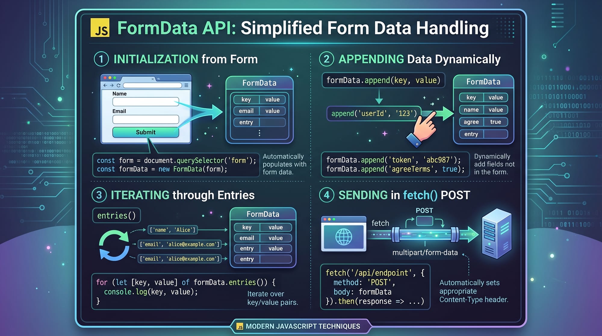 new FormData(form)→ collects form data.append()→ adds extra data.entries()→ loops through data