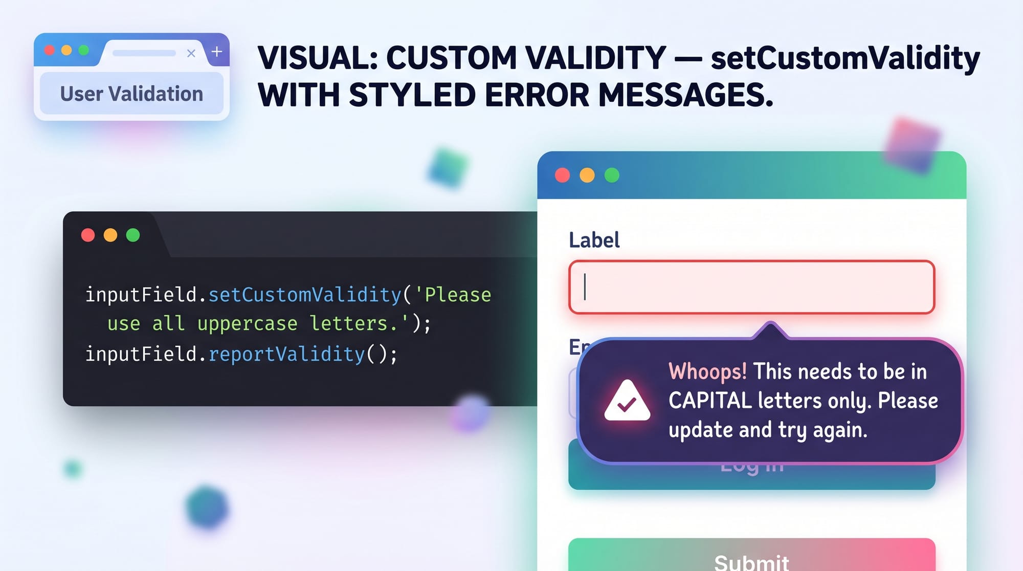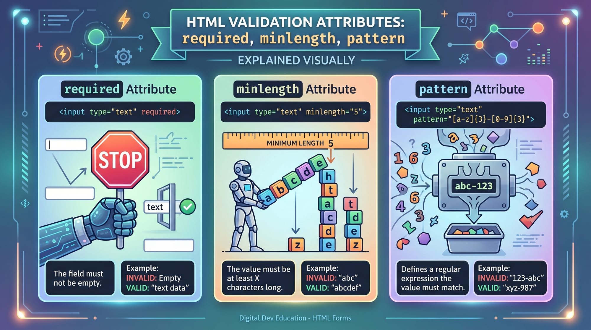 required→ ensures field is not emptyminlength/maxlength→ controls text lengthpattern→ regex-based validationtype→ email, number, url validationmin/max→ numeric limits