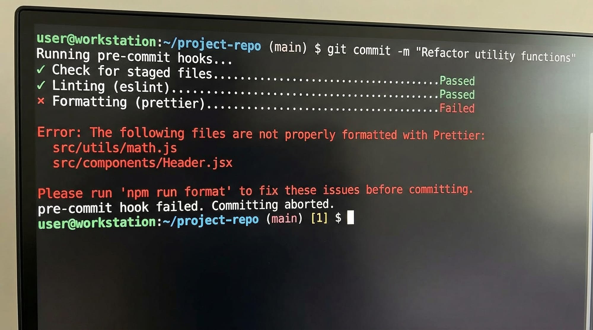 When Ahmad tries to commit code with errors, a pre-commit hook can block it.