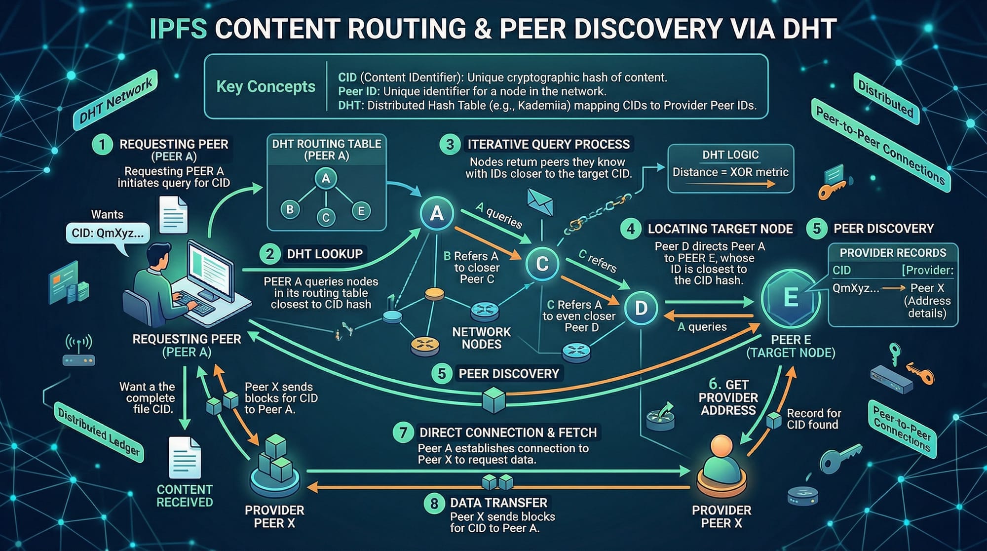 IPFS uses a DHT to locate content across peers. When Fatima tries to fetch a file, IPFS searches the network to find a node that stores the requested CID.