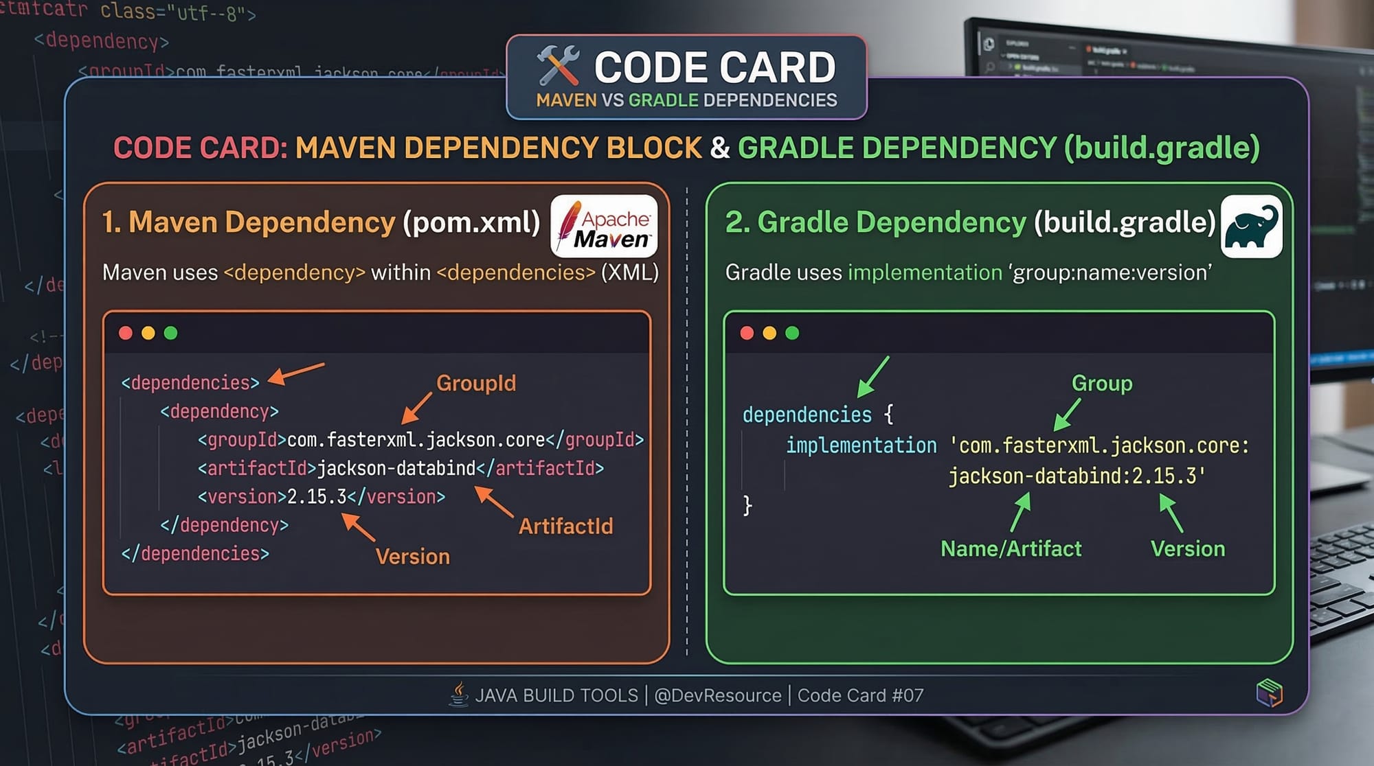 pom.xml, Gradle usesbuild.gradle. - Both manage dependencies, compile code, run tests, and package applications.