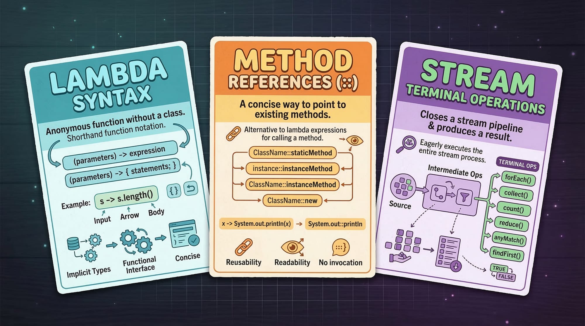 filter(),map(),sorted()). - Terminal Operations: Produce a result or side-effect (e.g.,