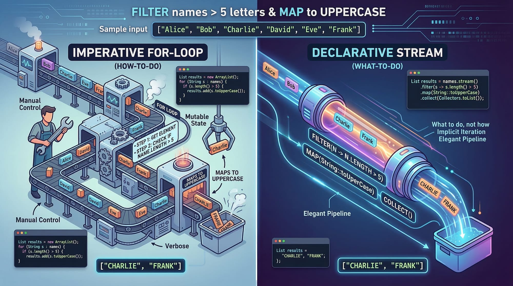 students.stream()creates a stream from the list.filter(name -> name.startsWith("A"))selects names starting with 'A'.map(String::toUpperCase)converts each name to uppercase.collect(Collectors.toList())gathers the results into a list.