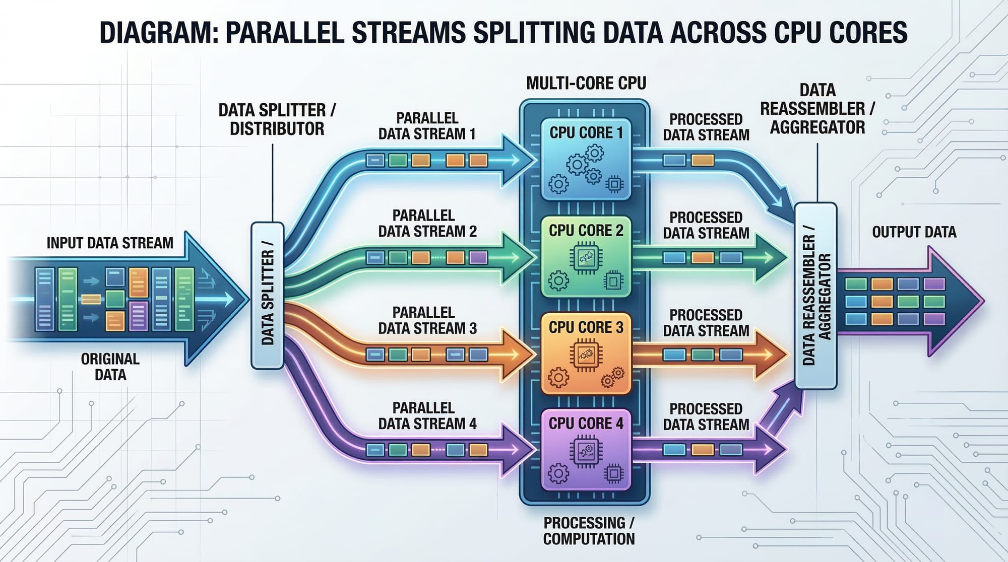 Parallel streams split tasks across CPU cores but may cause issues with shared mutable data.