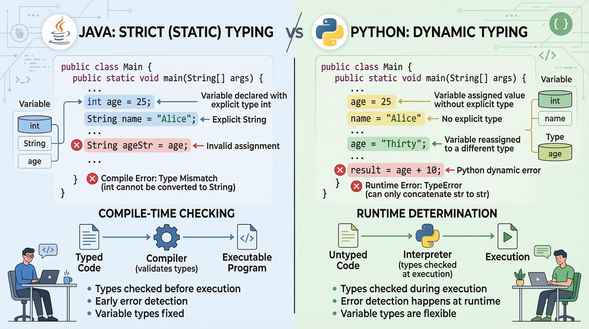 Java requires explicit types, while Python automatically detects types.