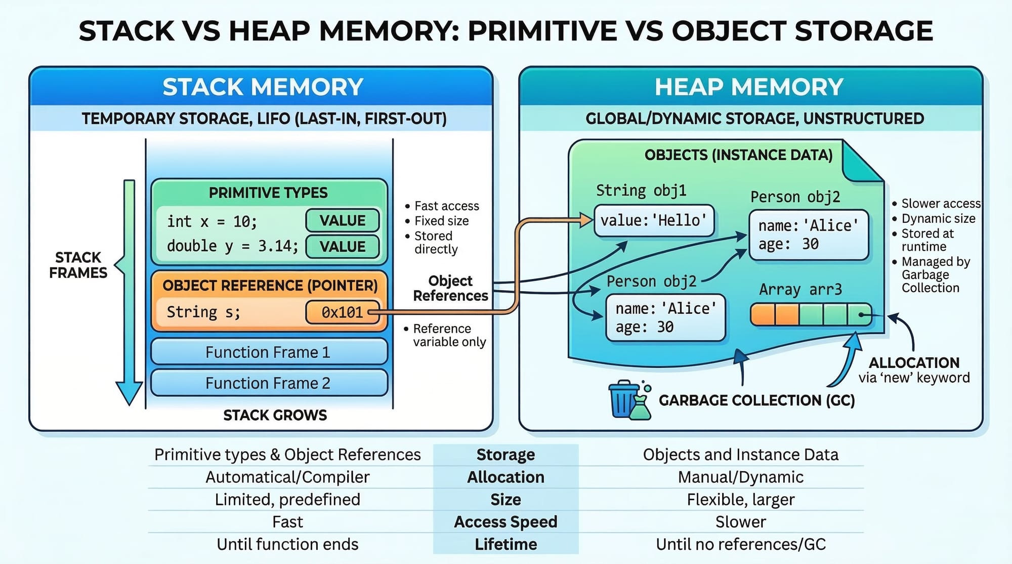 Primitive variables like int are stored in stack memory, while objects like String are stored in heap memory.