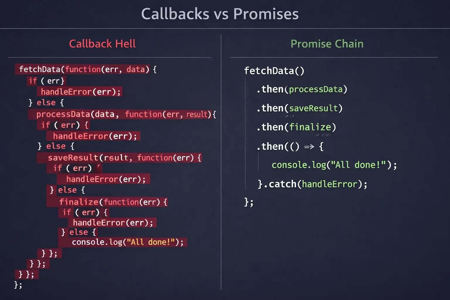 This "pyramid of doom" is hard to read, hard to debug, and easy to break. That's exactly why Promises were invented.