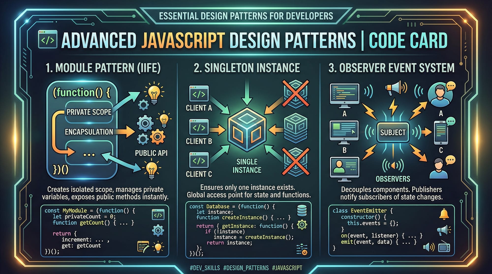 JavaScript design patterns are proven solutions to common problems in software development. In this tutorial, we’ll explore three powerful patterns: Module Pattern, Observer Pattern, and Factory Pattern—all essential for writing scalable, maintainable JavaScript applications.