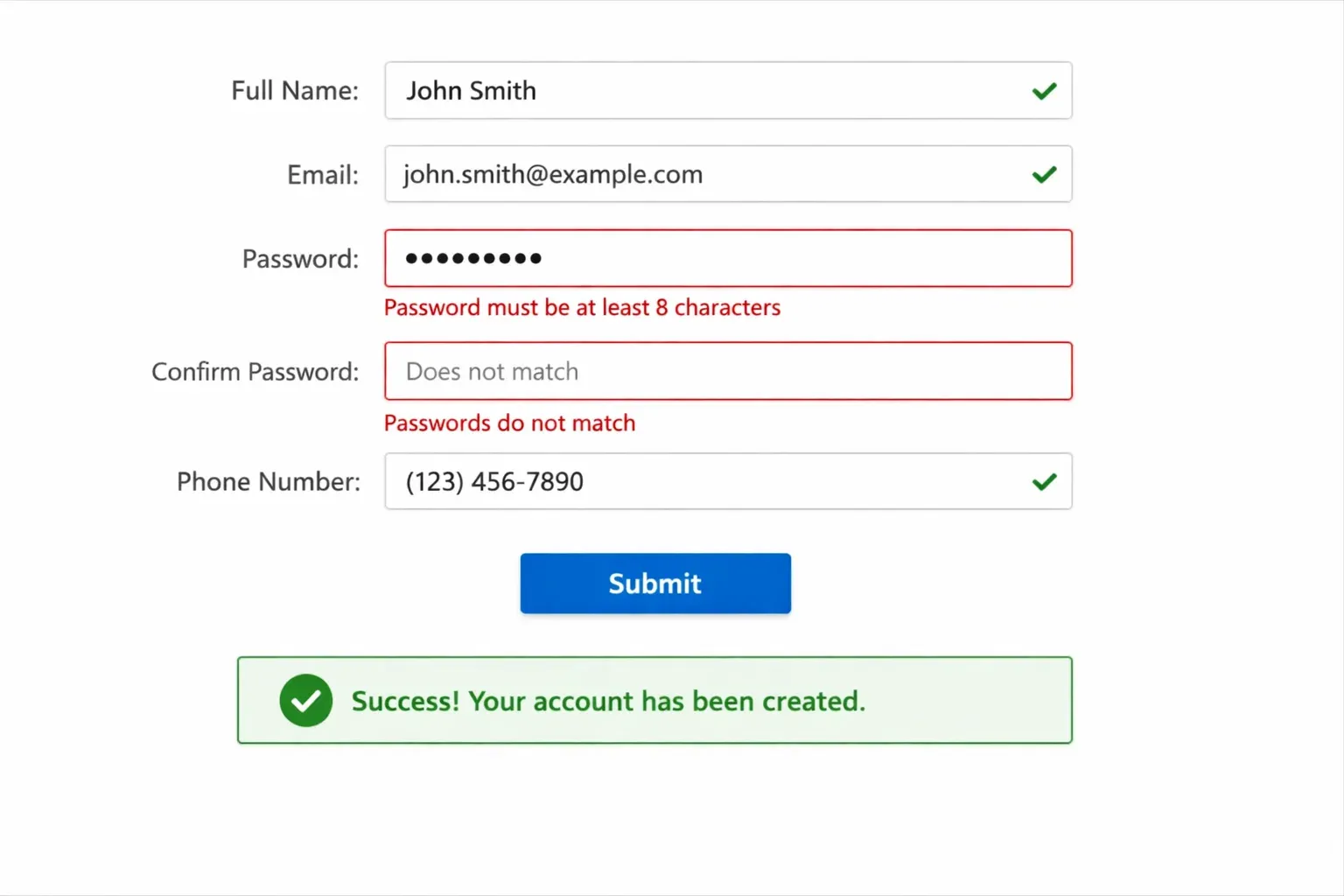 inputfor real-time feedback on every keystroke,blurfor validation when a user leaves a field,submitfor form handling,mouseover/mouseoutfor hover effects, andkeydownfor keyboard shortcuts.