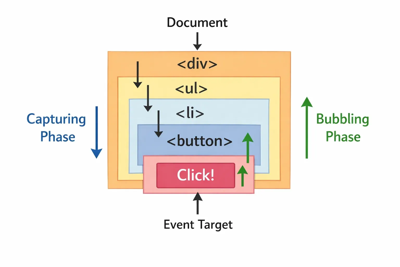 When you click a button inside a <div>, you are technically clicking both the button and the div. JavaScript handles this through a process called event propagation, which has two phases: