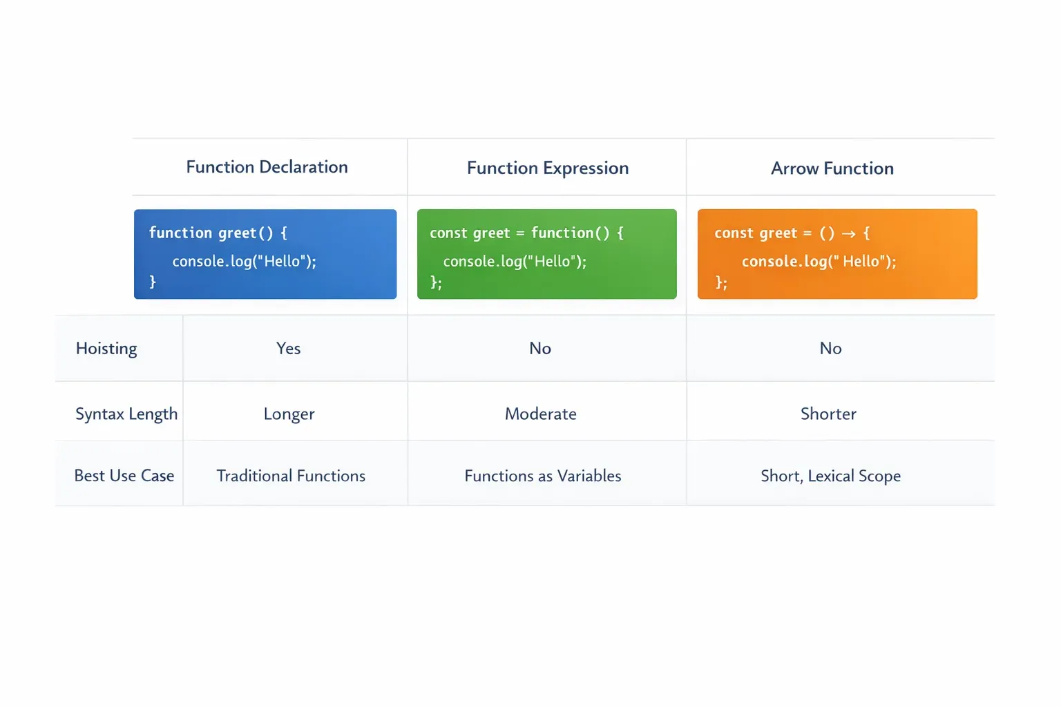 - Choose the right form for the job — use function declarations for main, named utilities; function expressions when you need to conditionally define or pass a function; and arrow functions for concise callbacks and modern ES6+ code.