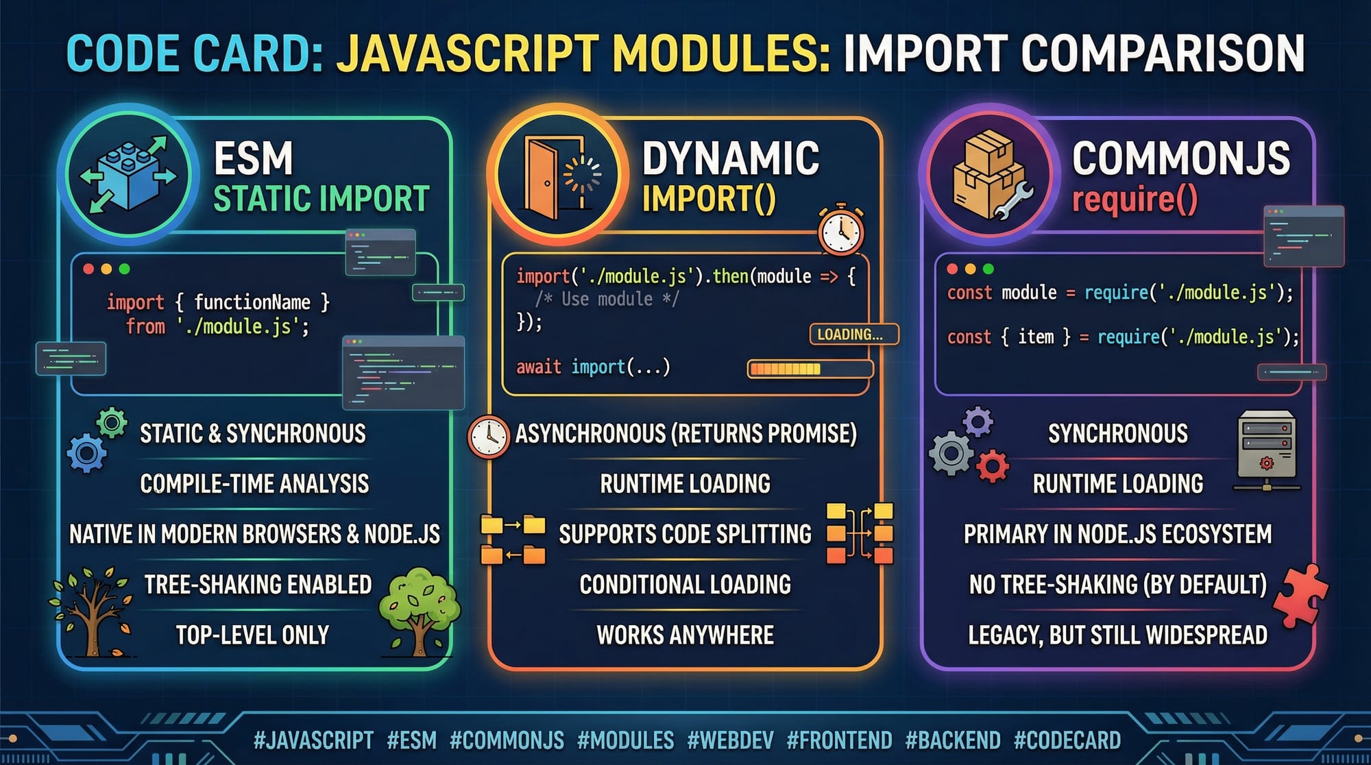 - ES Modules (ESM): Native in browsers and Node.js (v13+). Uses