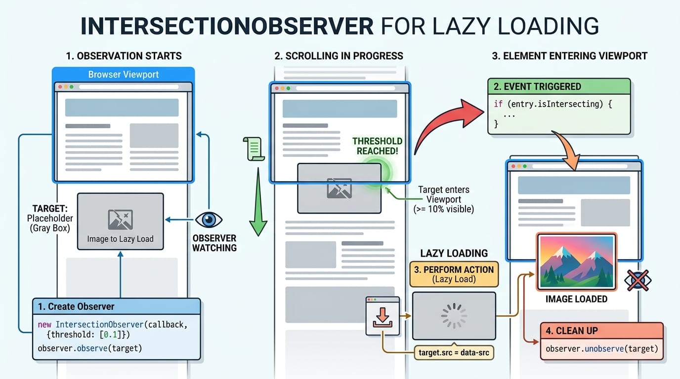 - IntersectionObserver API → Detect visibility (used for lazy loading)