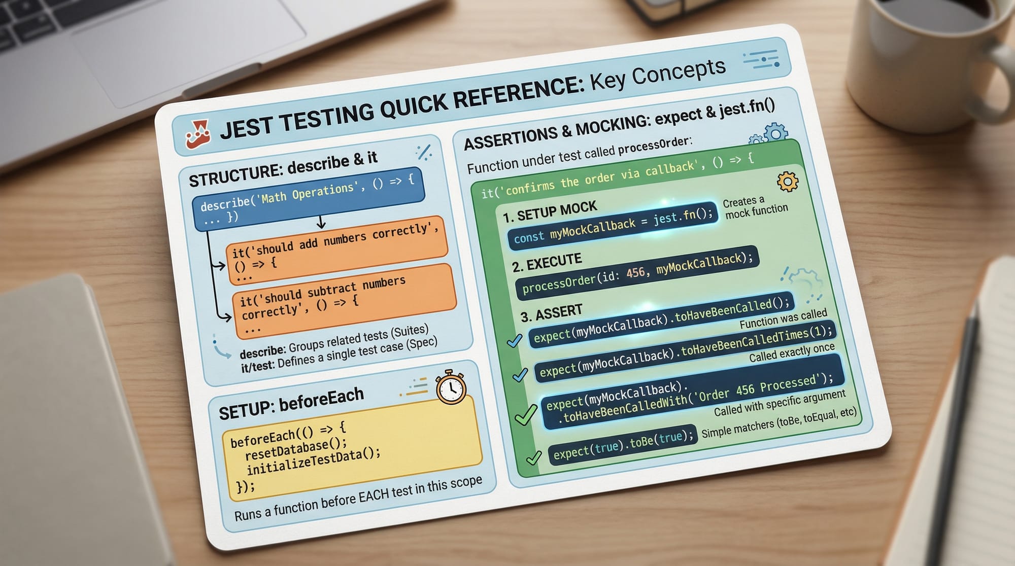 jest.fn()for testing APIs and dependencies. - Always handle async code properly to avoid test failures.