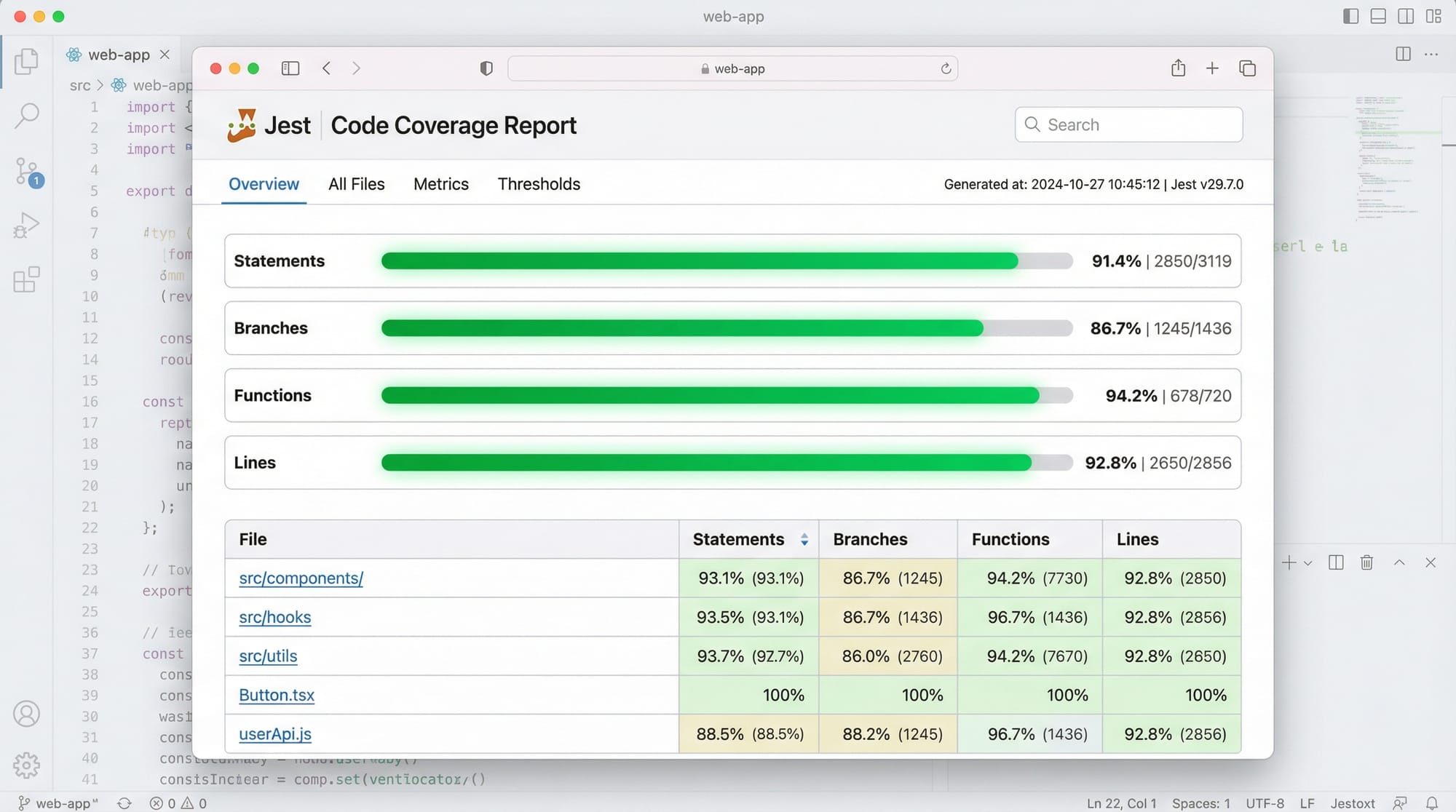 Run jest --coverage in your project. Jest outputs percentages for statements, branches, functions, and lines.