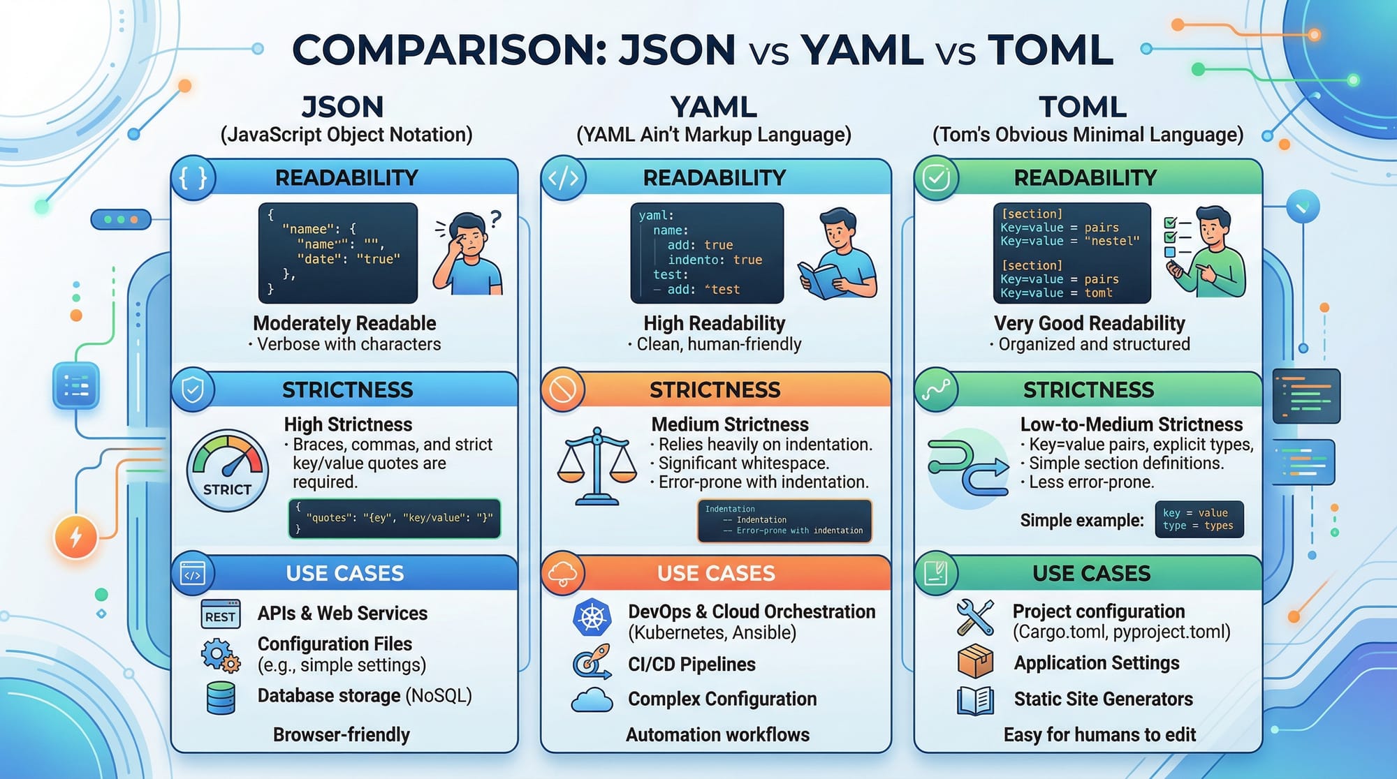 - JSON is strict; YAML is more readable and flexible.
