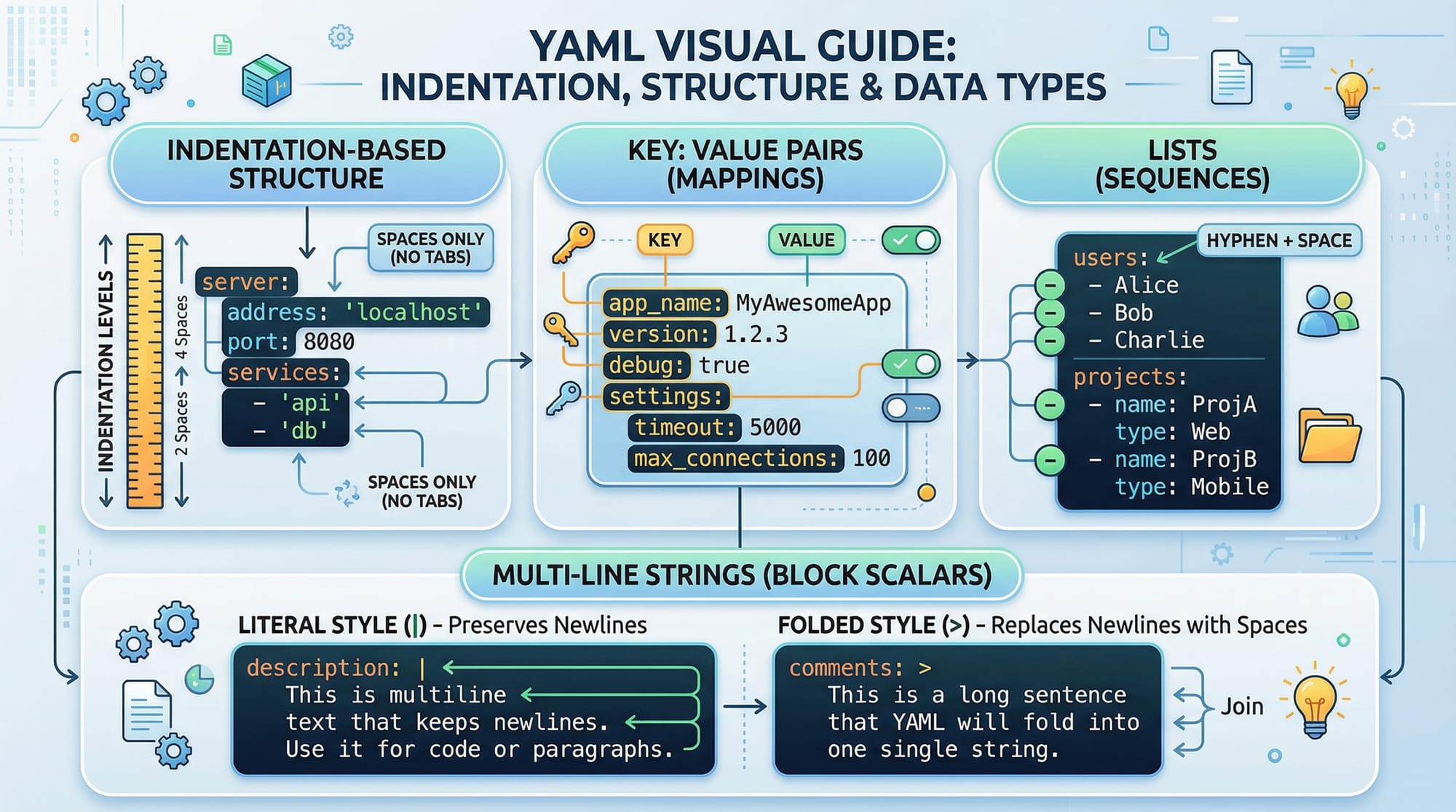 - Avoid common mistakes like invalid syntax in JSON and indentation errors in YAML.