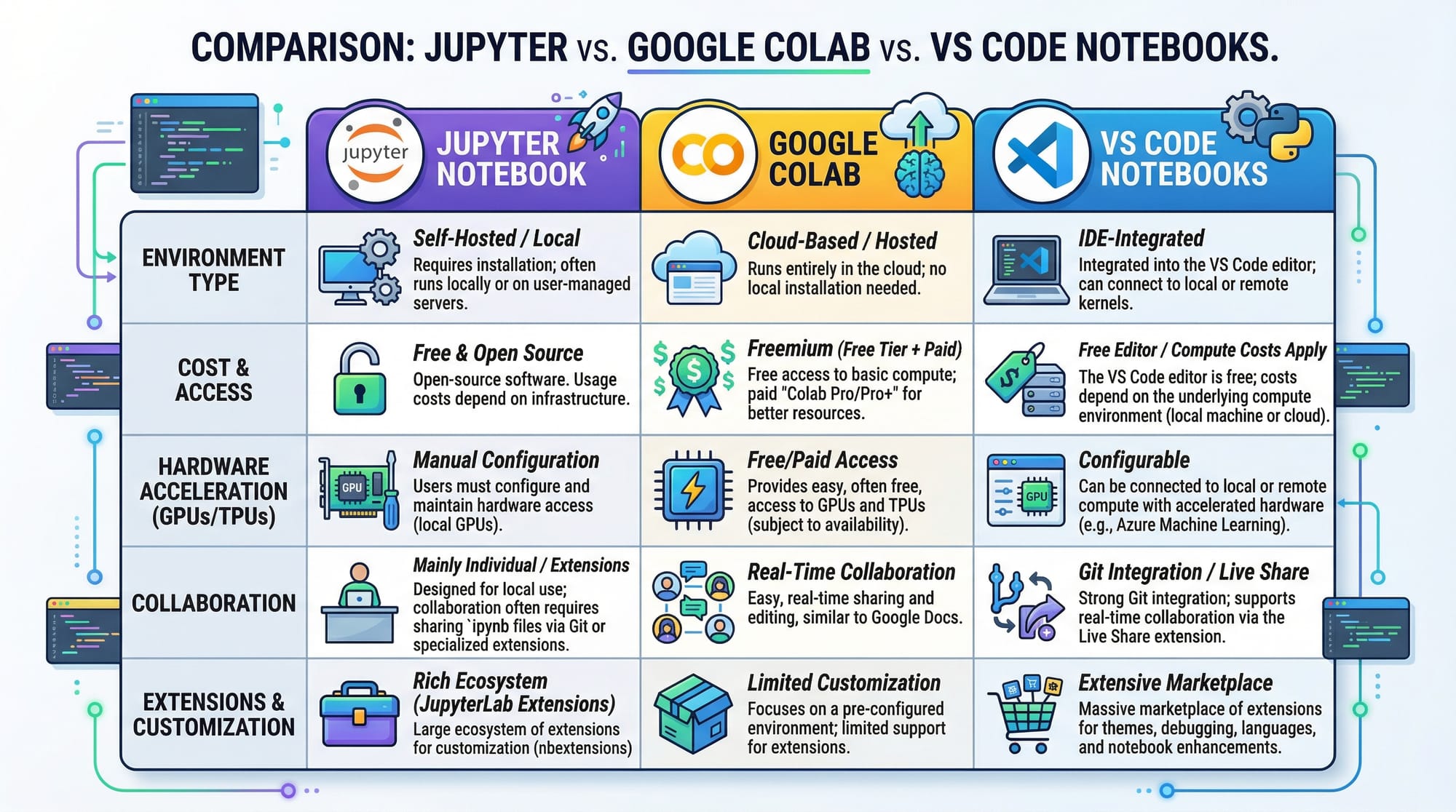 - JupyterLab → more powerful, supports multiple tabs and tools