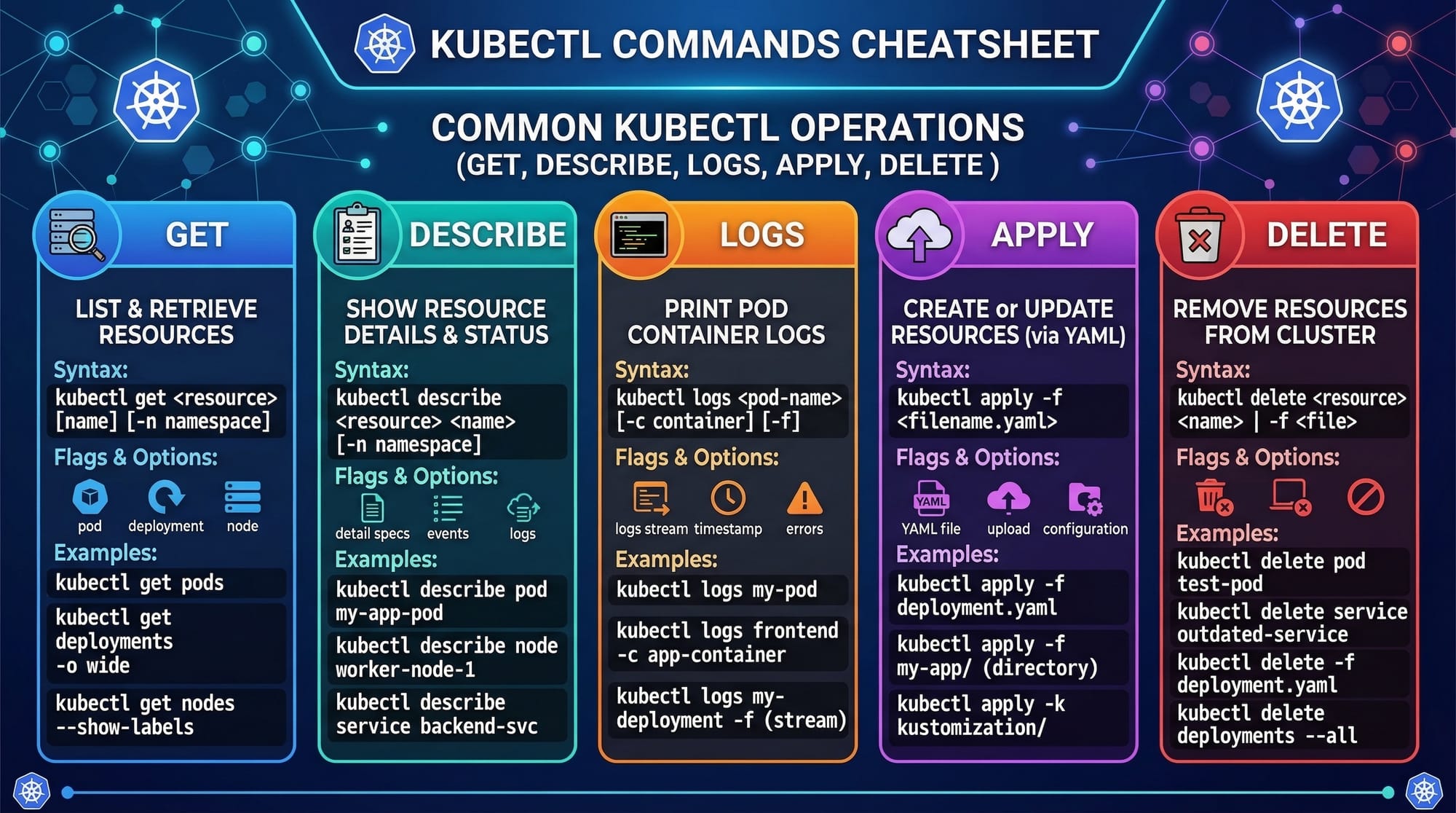 kubectl get podskubectl describe pod <name>kubectl logs <pod>kubectl apply -f file.yamlkubectl delete pod <name>