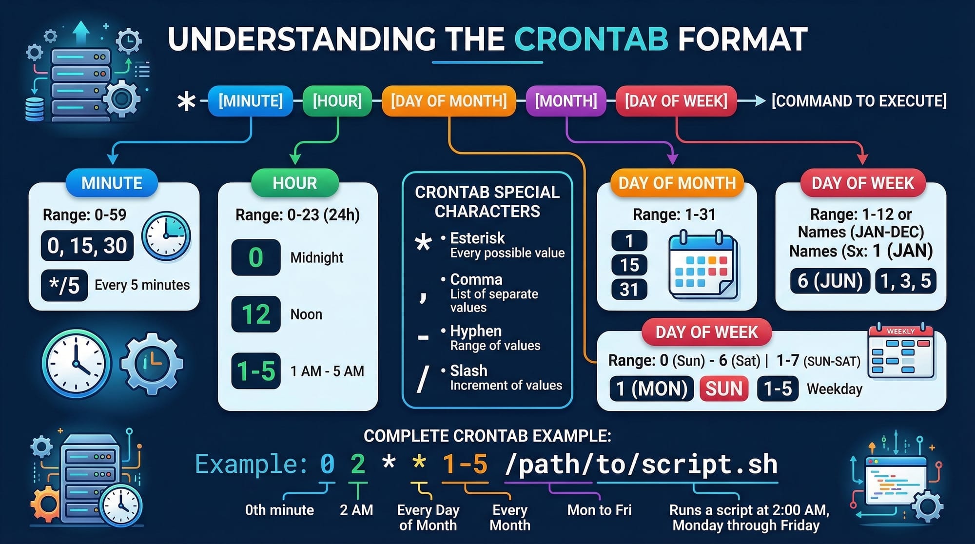 Use crontab -e to edit your cron jobs. Follow the format: minute hour day month weekday command.